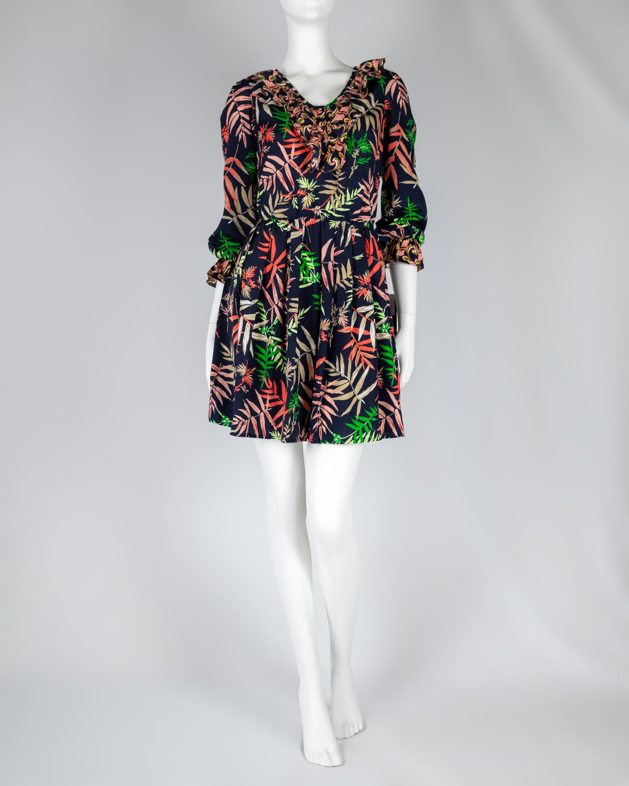 3/4 Sleeve Palm Print Ruffle Trim Dress Size XS