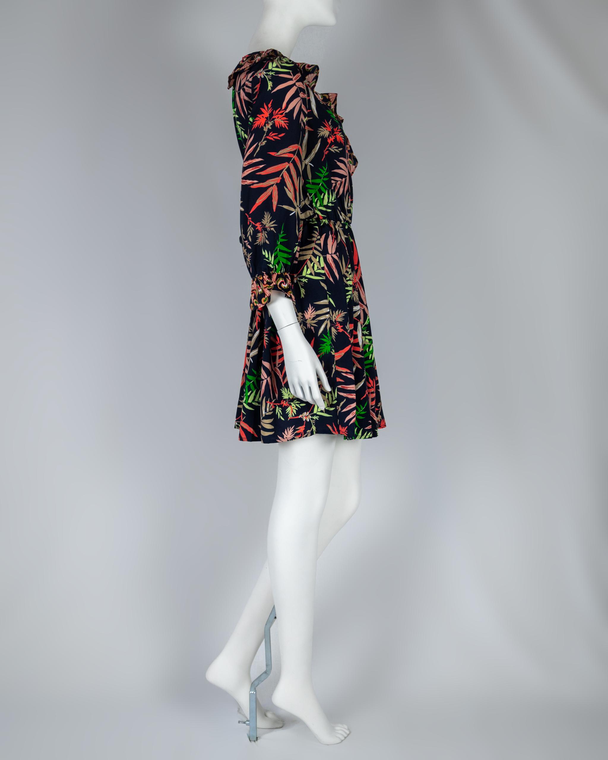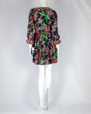 This vibrant tropical print mini dress is designed to capture the essence of a sun-soaked paradise. The dress features an eye-catching pattern with lush, oversized palm leaves. The color palette is a lively mix of bright corals, rich pinks, and bold greens, evoking the feel of a tropical getaway.