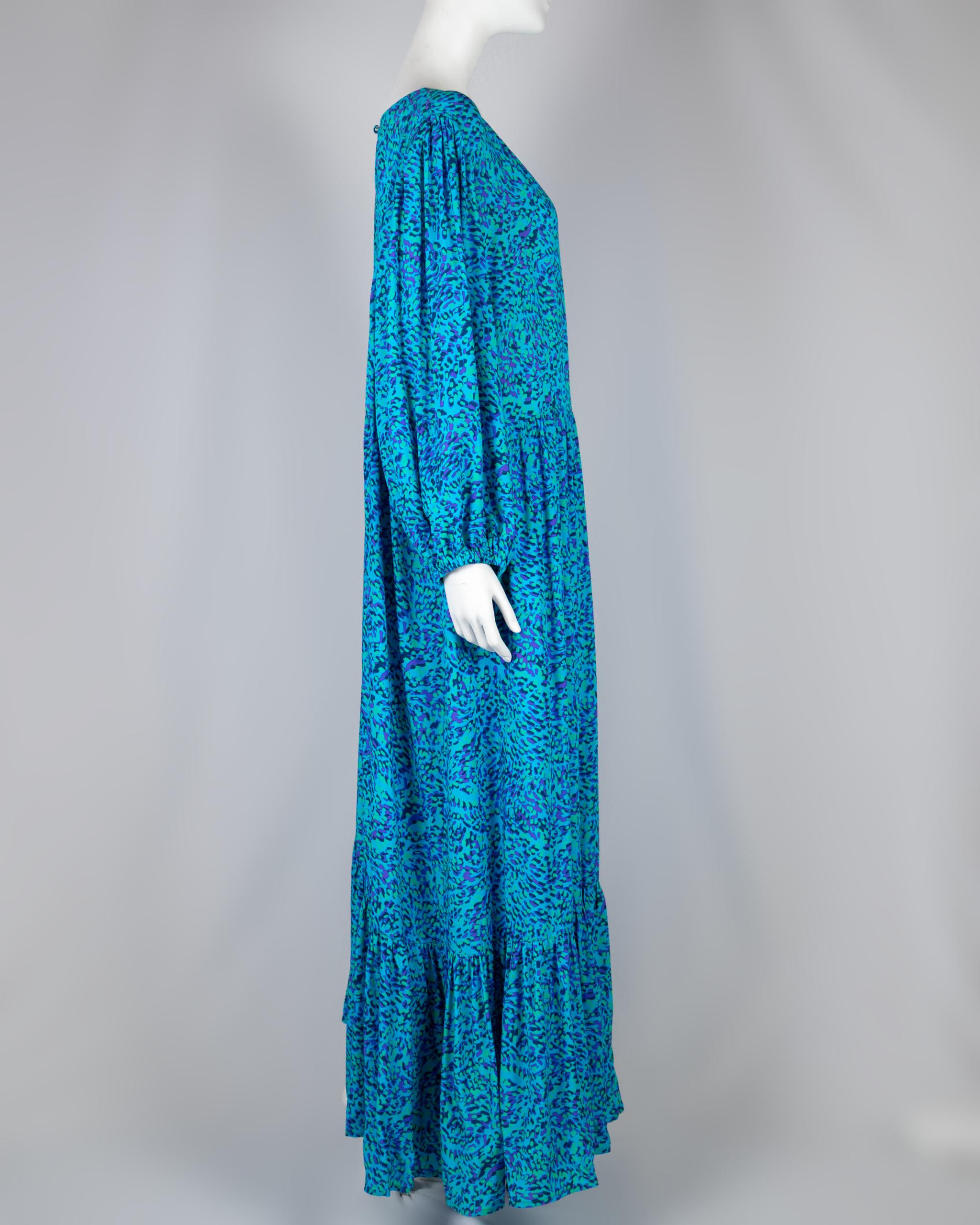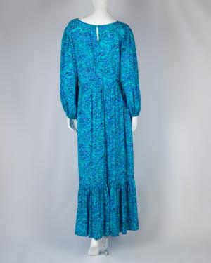 Flowy and vibrant, the Angie Dress features a 3/4 blouse sleeve, full maxi length, side seam pockets, and an extended bottom ruffle for the most beautiful movement. Available in our Peacock print, this vibrant dress is a show-stopper. Pairs well with sandals or heels for a fun night out, wedding, or shower.