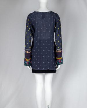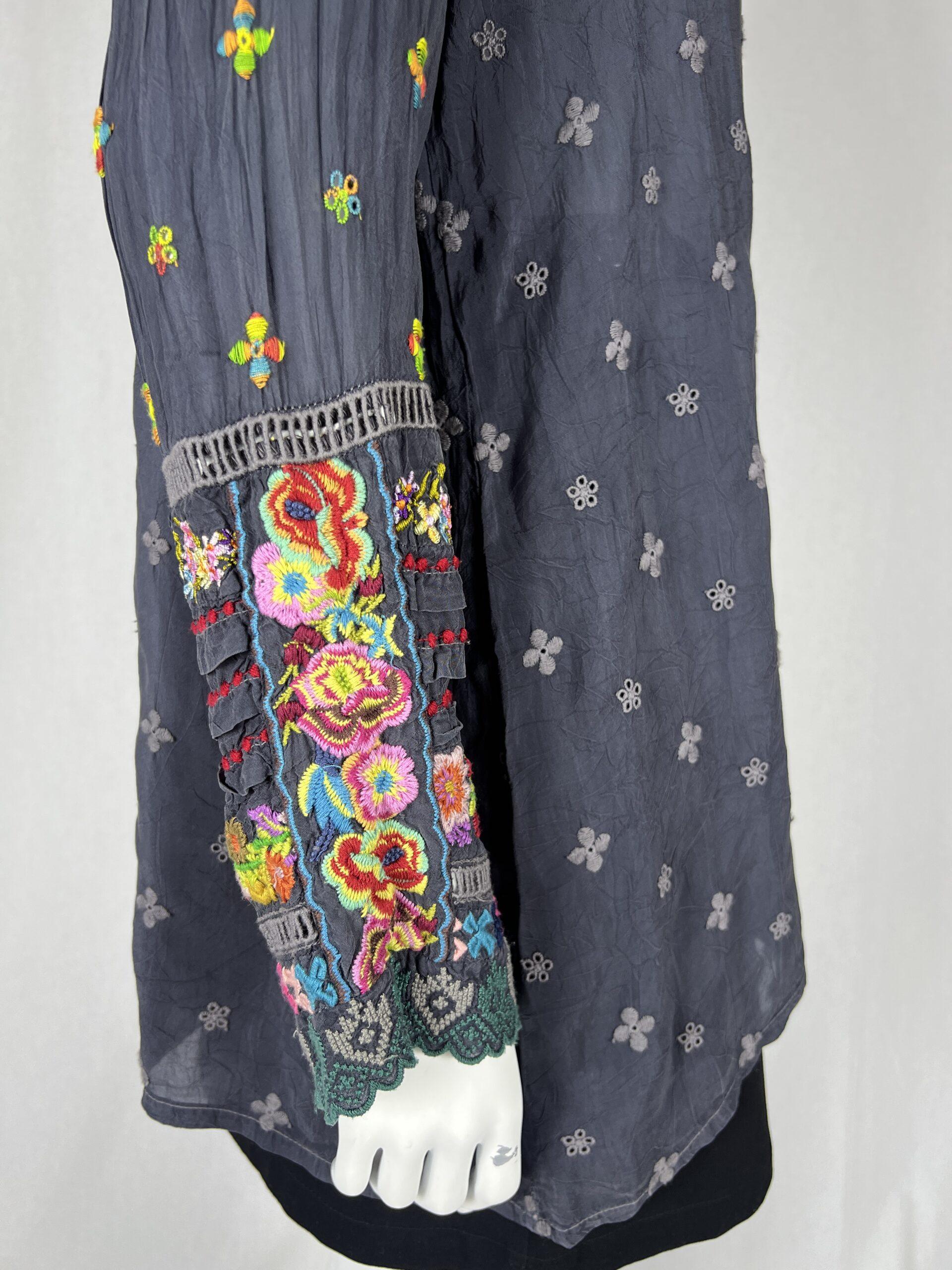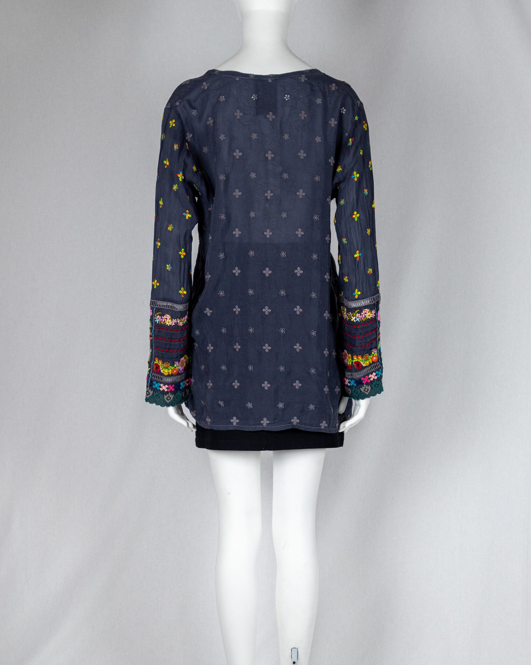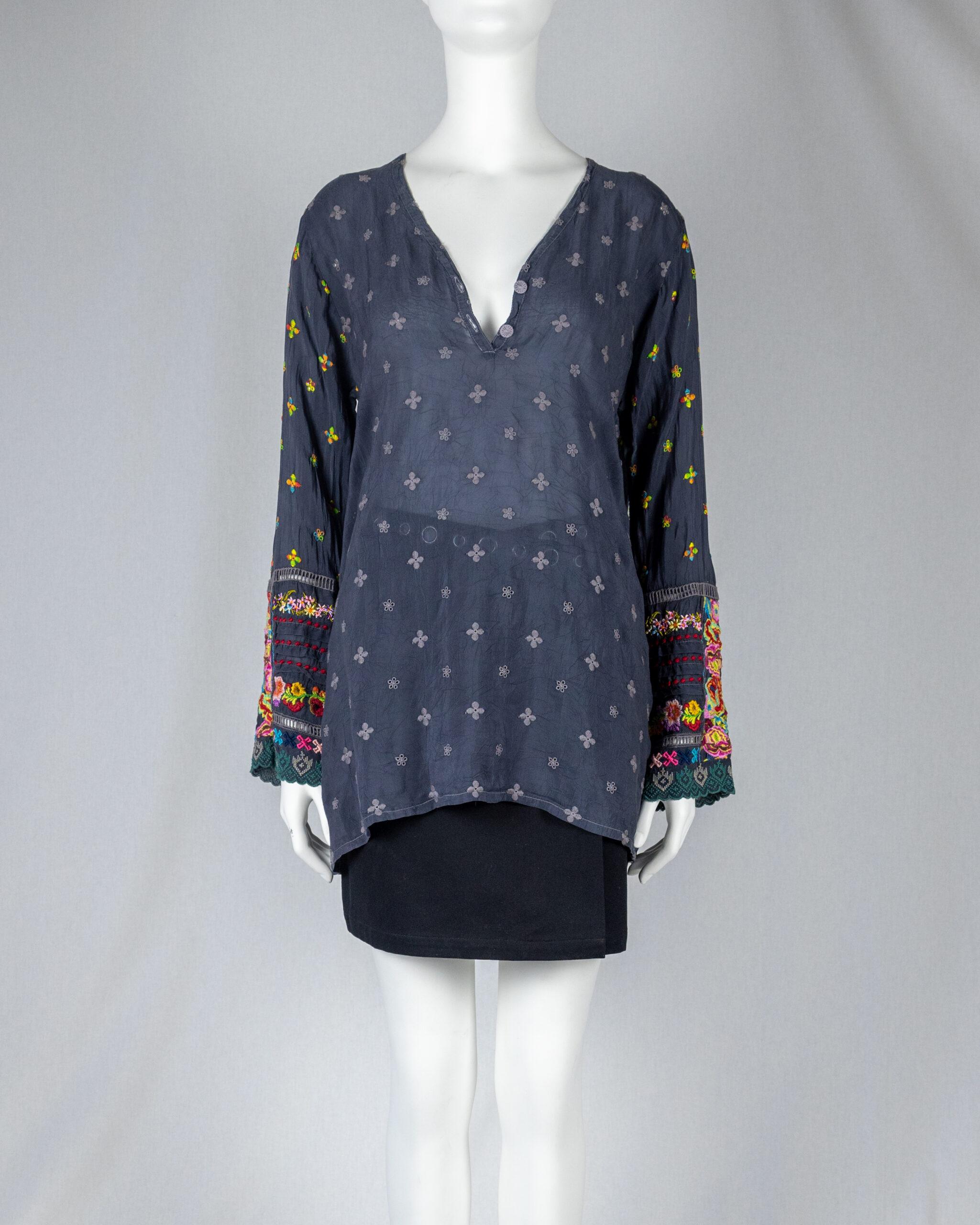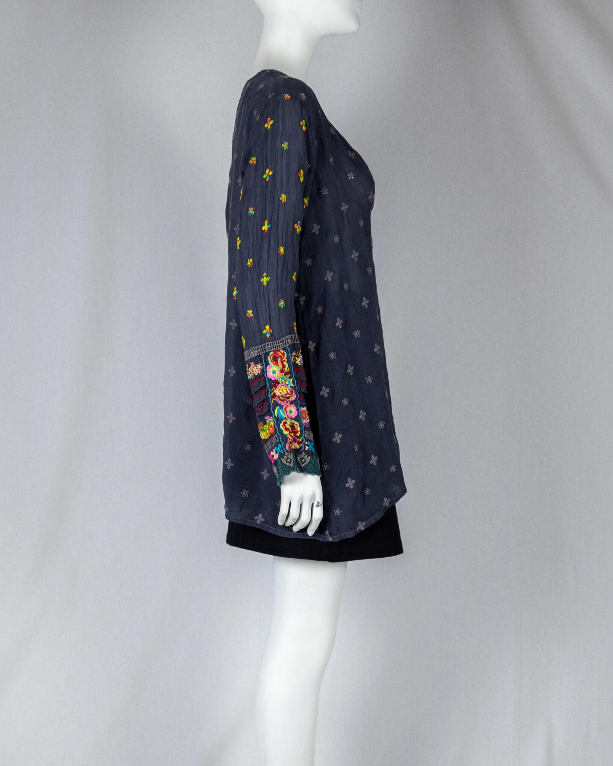 This Johnny Was tunic top is a trendy must-have with a boho-chic look. Ensure your wardrobe shows you off to your best advantage with clothing from Johnny Was. It is made of lightweight satiny fabric and is designed in a solid color with floral embroideries. It also features a v-neckline with long sleeves, and a hem that hits the hip.