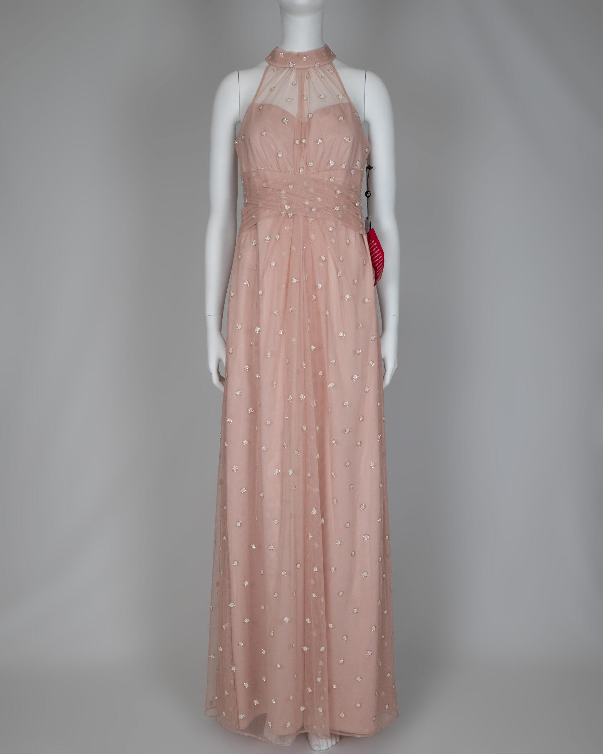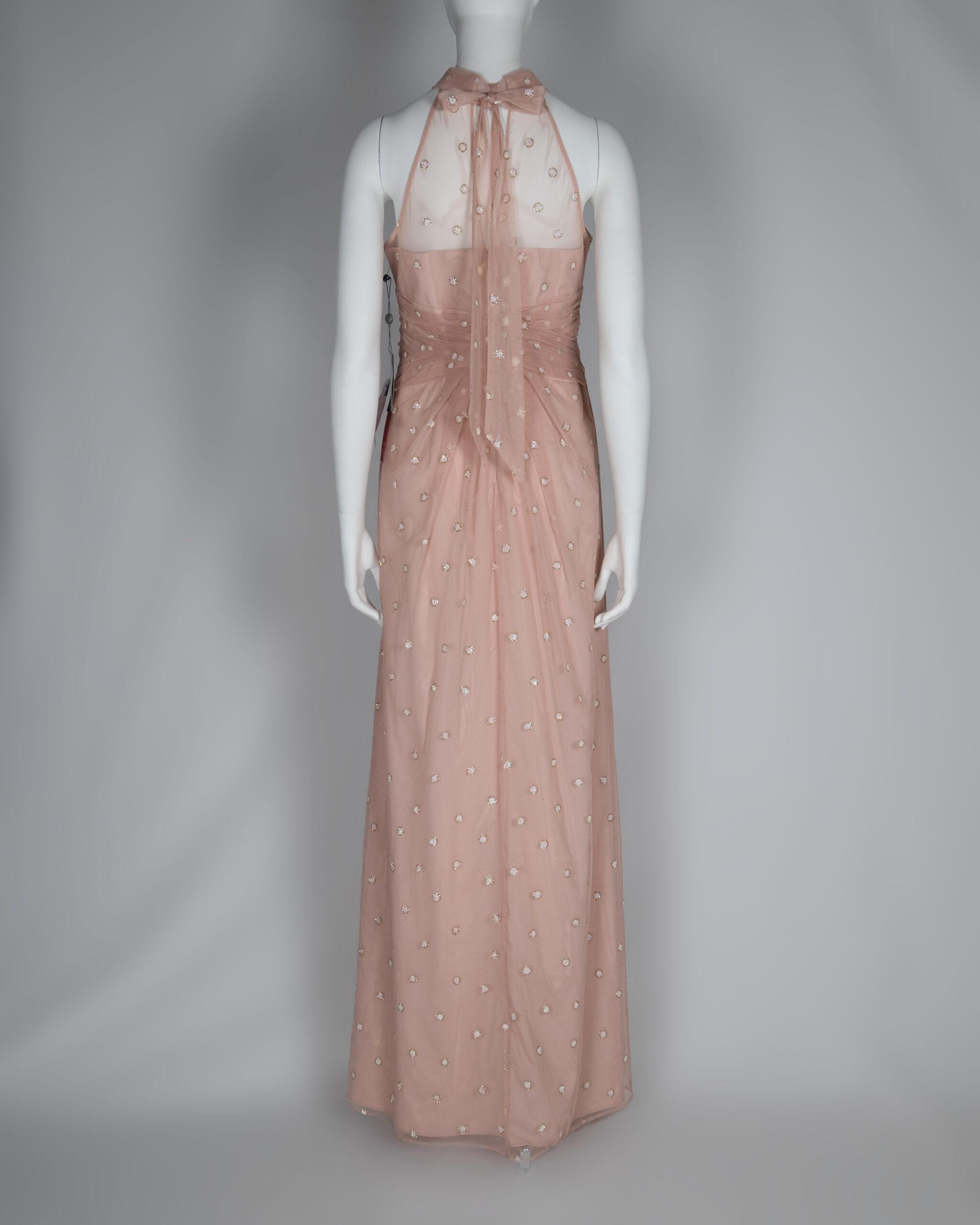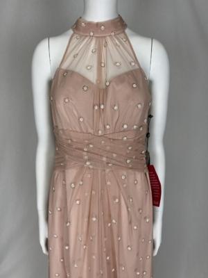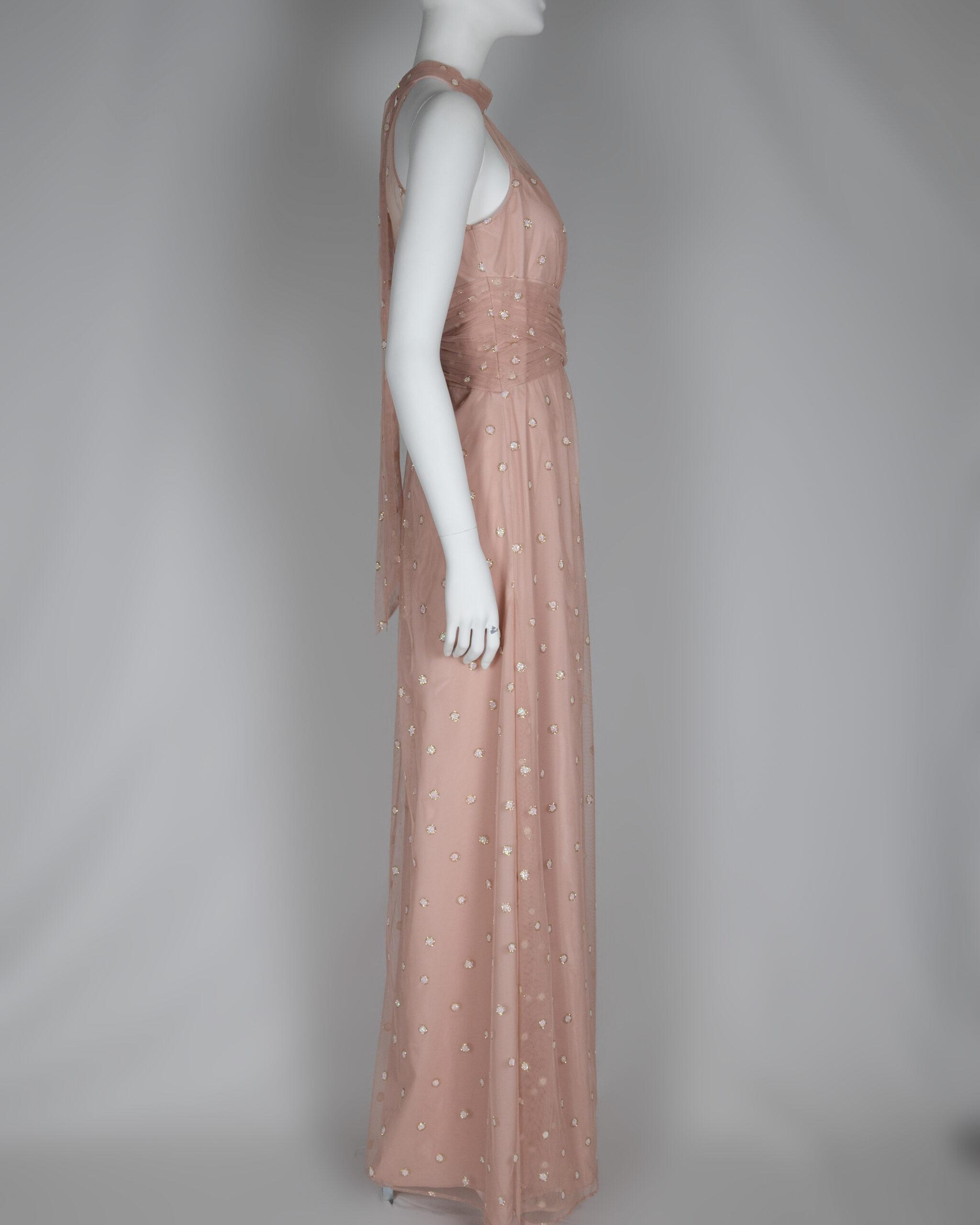 An illusion yoke and gathered waistband lend flattering elements to a flowy gown patterned with metallic polka dots for scene-stealing appeal.
