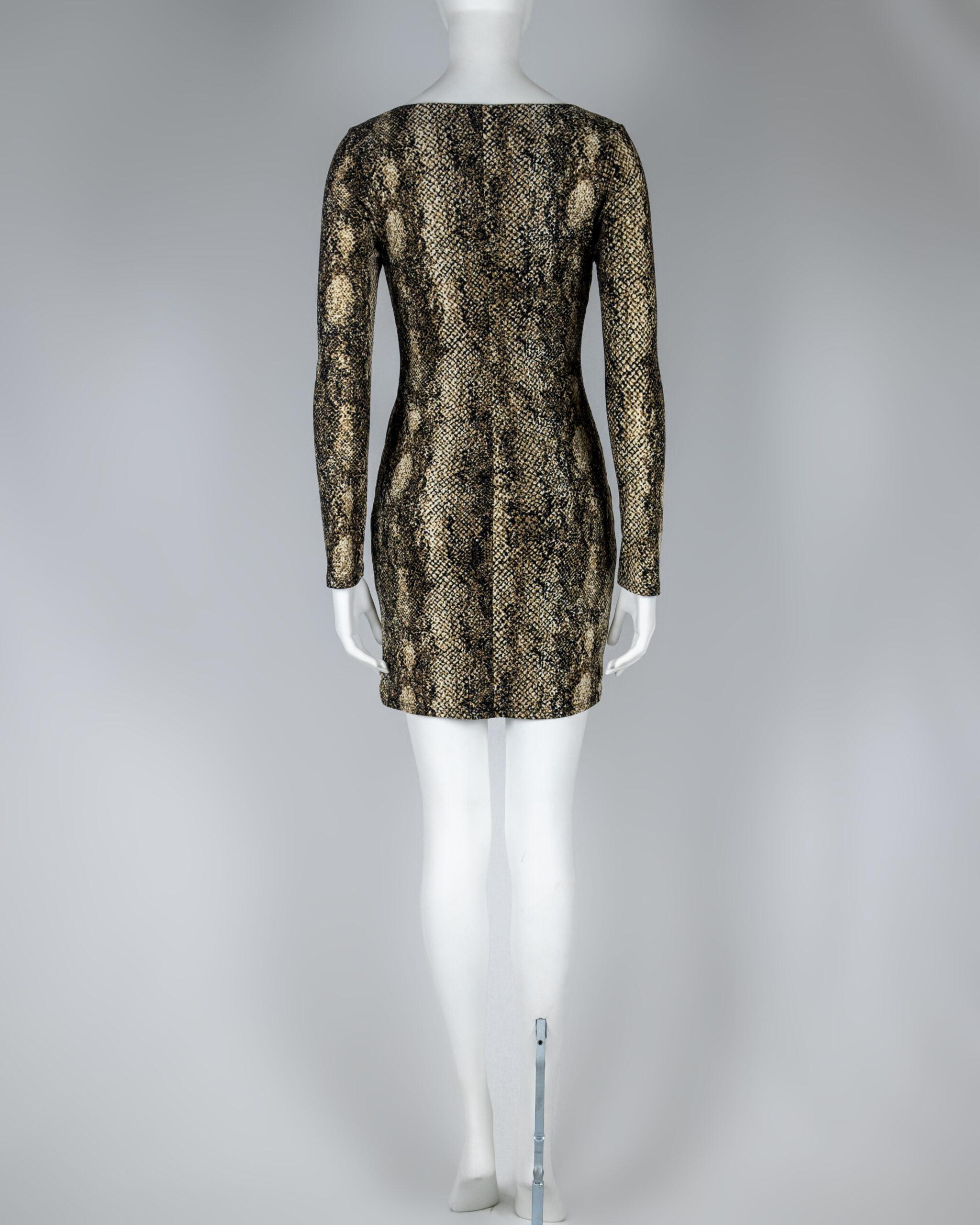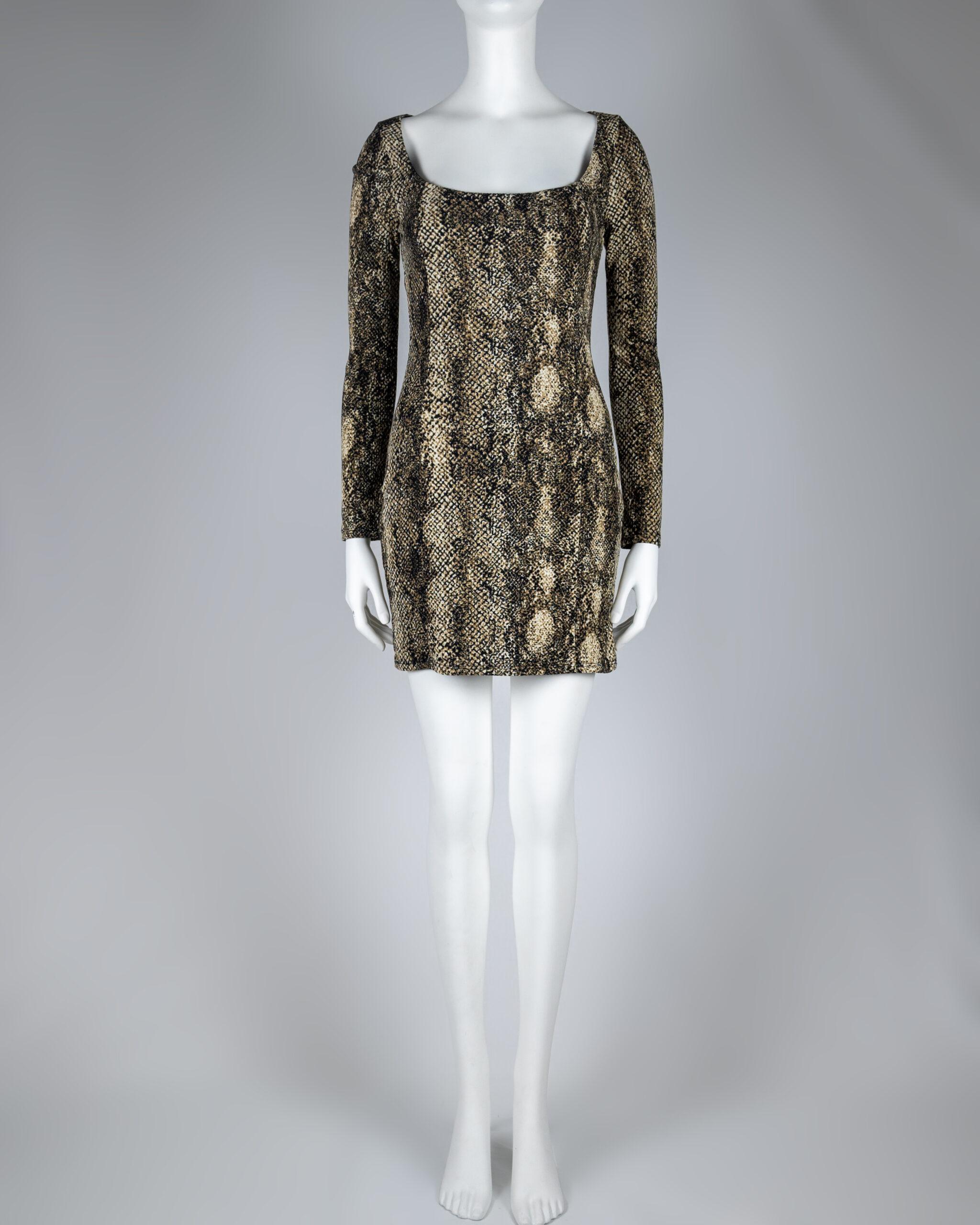 Look sleek and chic in this snakeskin-print dress, a curve-hugging bodycon silhouette framed by long sleeves and a mini length.