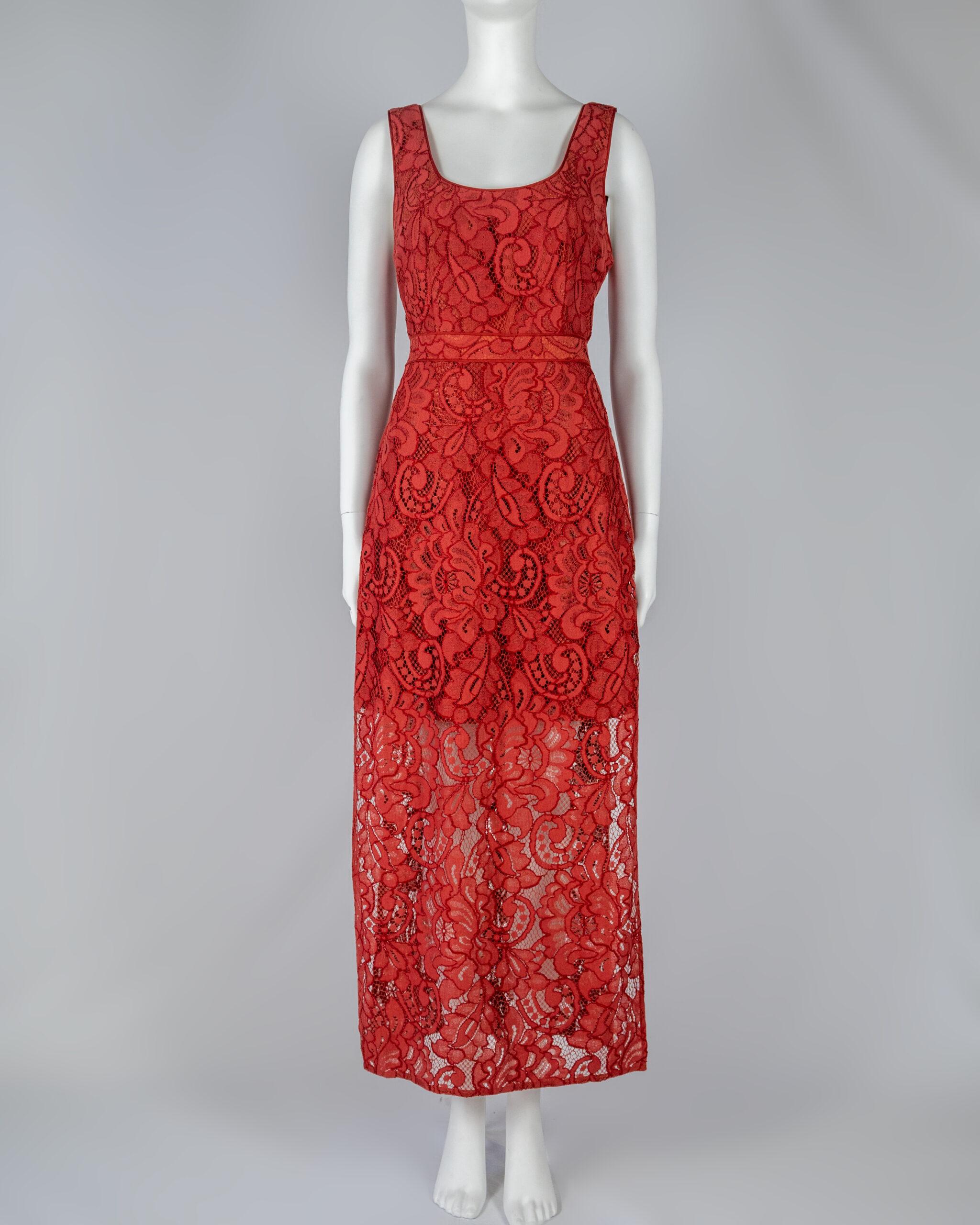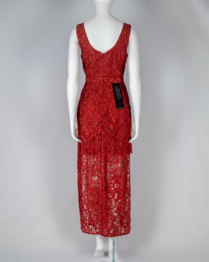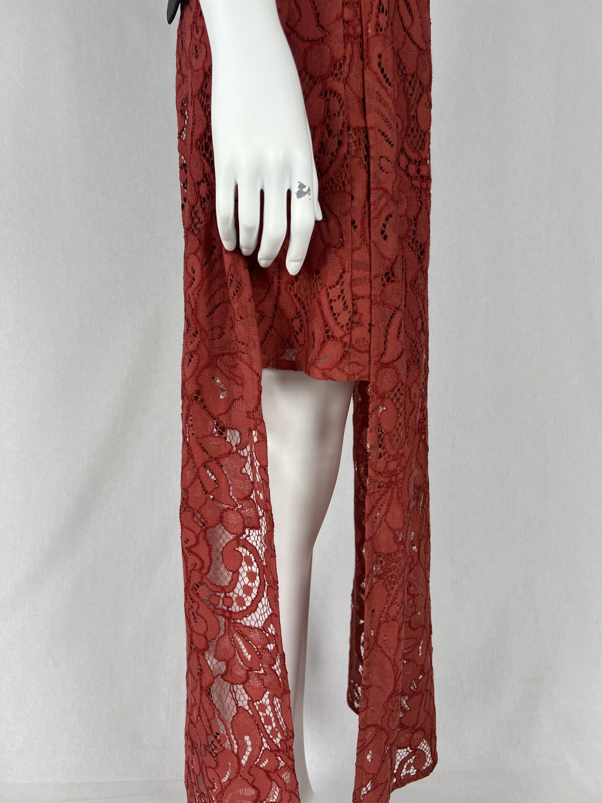 Ornate floral lace motifs in rich Tandoori Spice bring elegance to this sleeveless dress embellished with attached long panels layered over a shorter under skirt. Concealed center back zipper and hook-and-eye closures. Mid-weight, stretch fabric. Below-the-knee hemline.