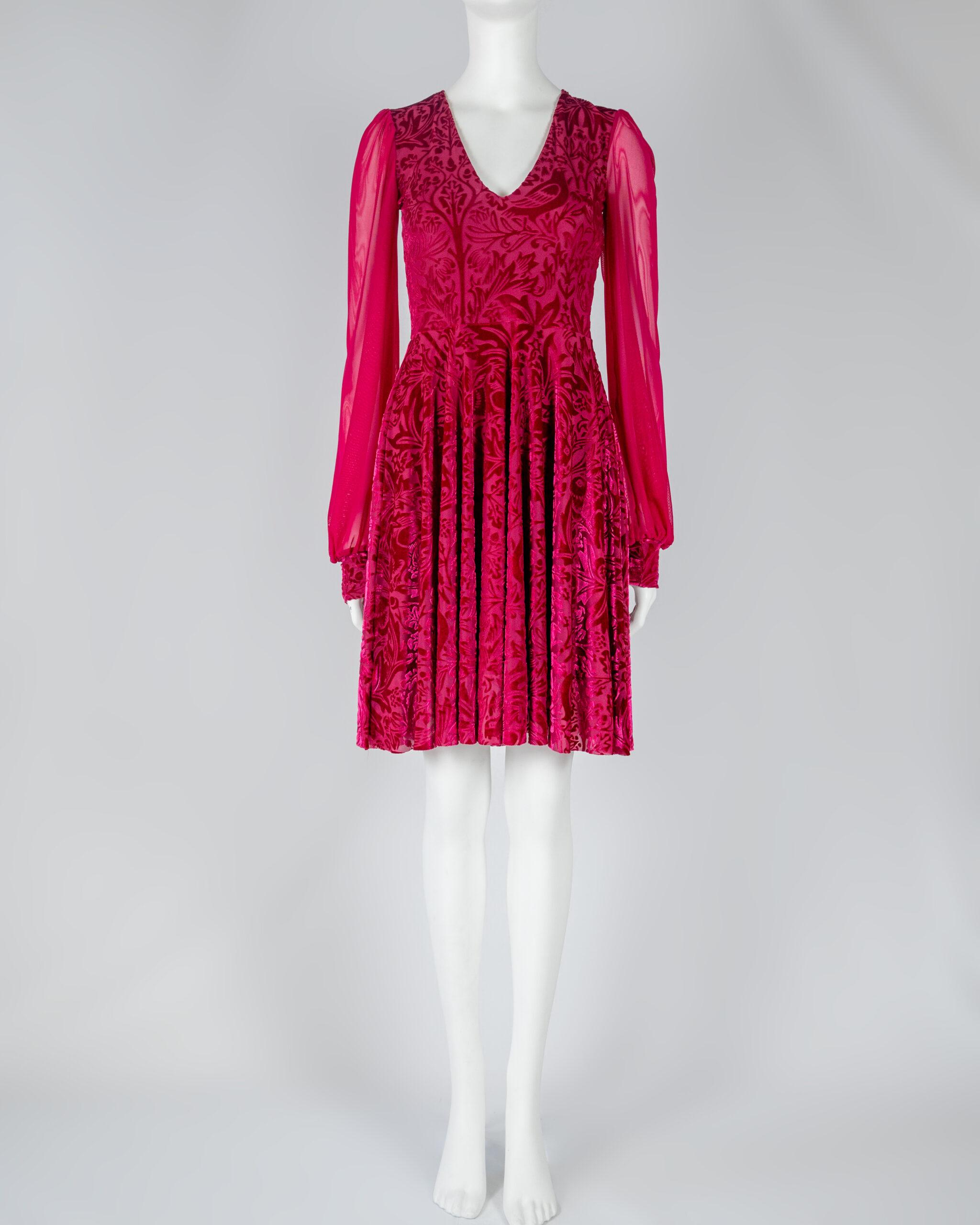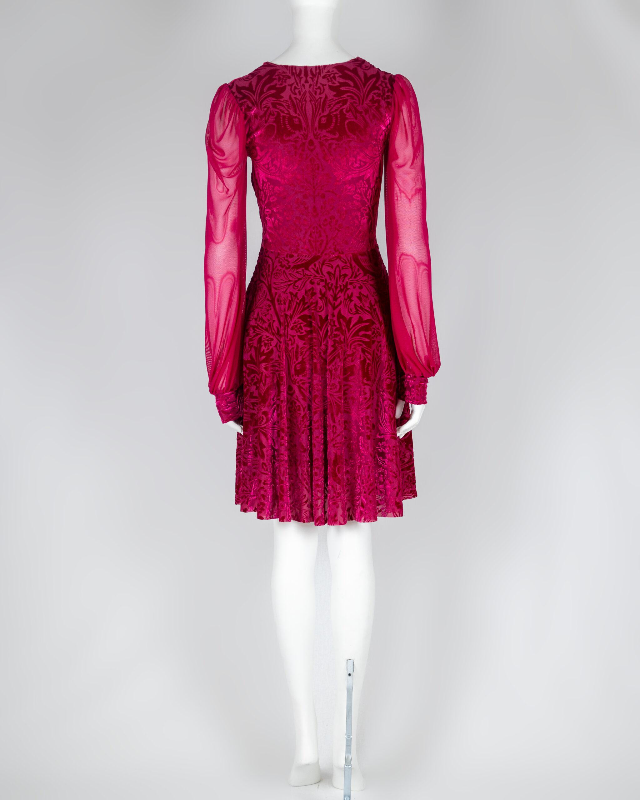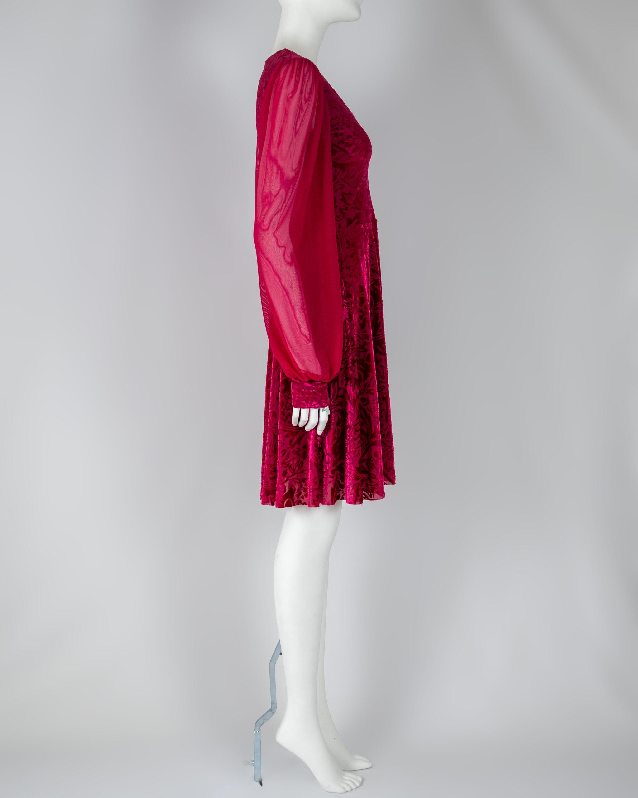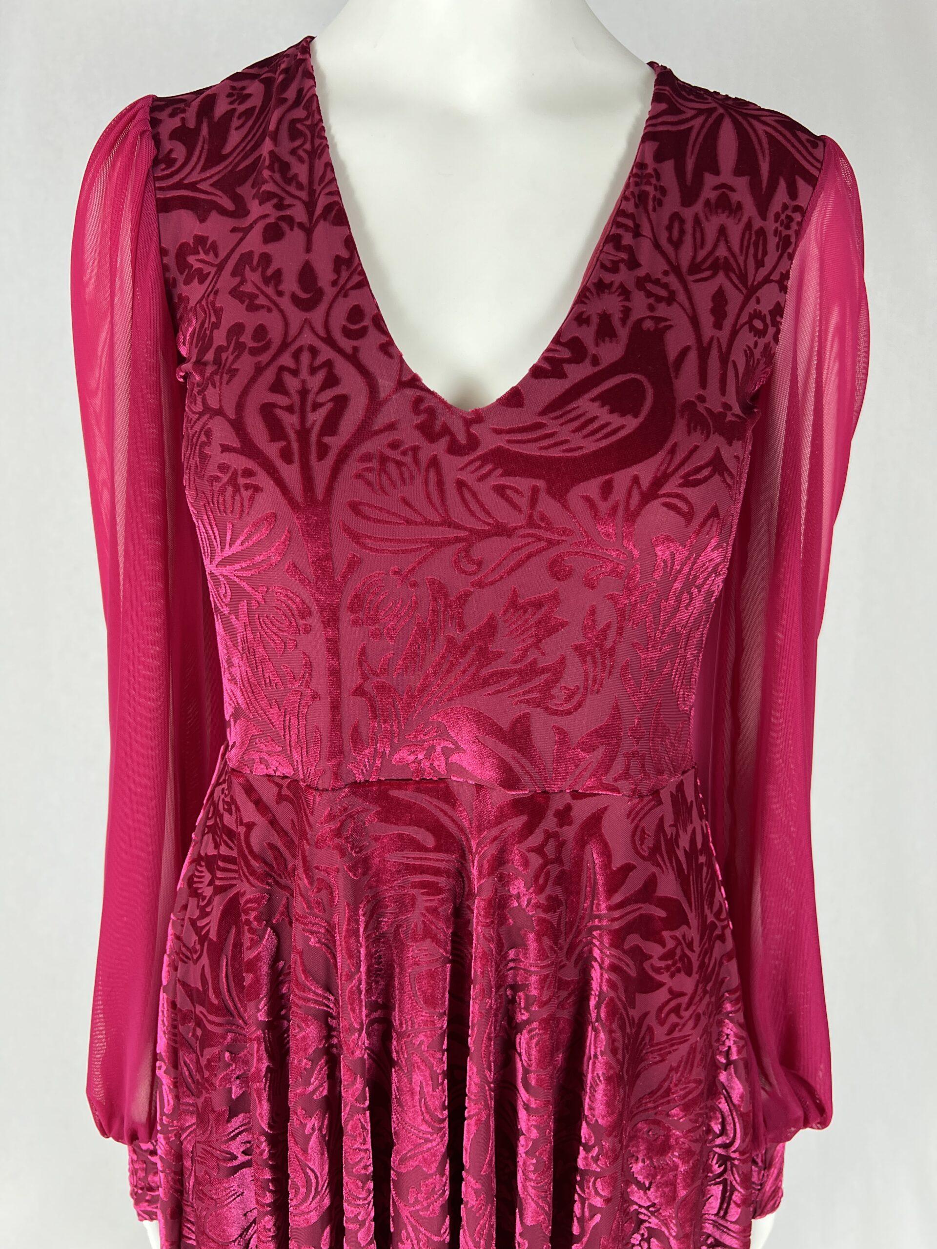 This custom Burned Velvet design features William Morris’ playful Brer Rabbit print! Made from our luxe Burned Velvet fabric, ruby red color with Brer Rabbit burnout design, flattering V-neck front, lightweight, sheer puffed sleeves with cuffed wrists, and around-the-knees length: perfect for an office-friendly vibe.