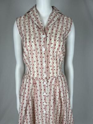This sweet vintage inspired lightweight dress from Unique Vintage will have you in style this summer! Adorable print of red cherries throughout a light pink and white stripe backdrop. This dress features a partial button up front, classic collar and is sleeveless. The pleated bust drops into a seamed waist while the sweeping swing skirt features pleated embellishments.