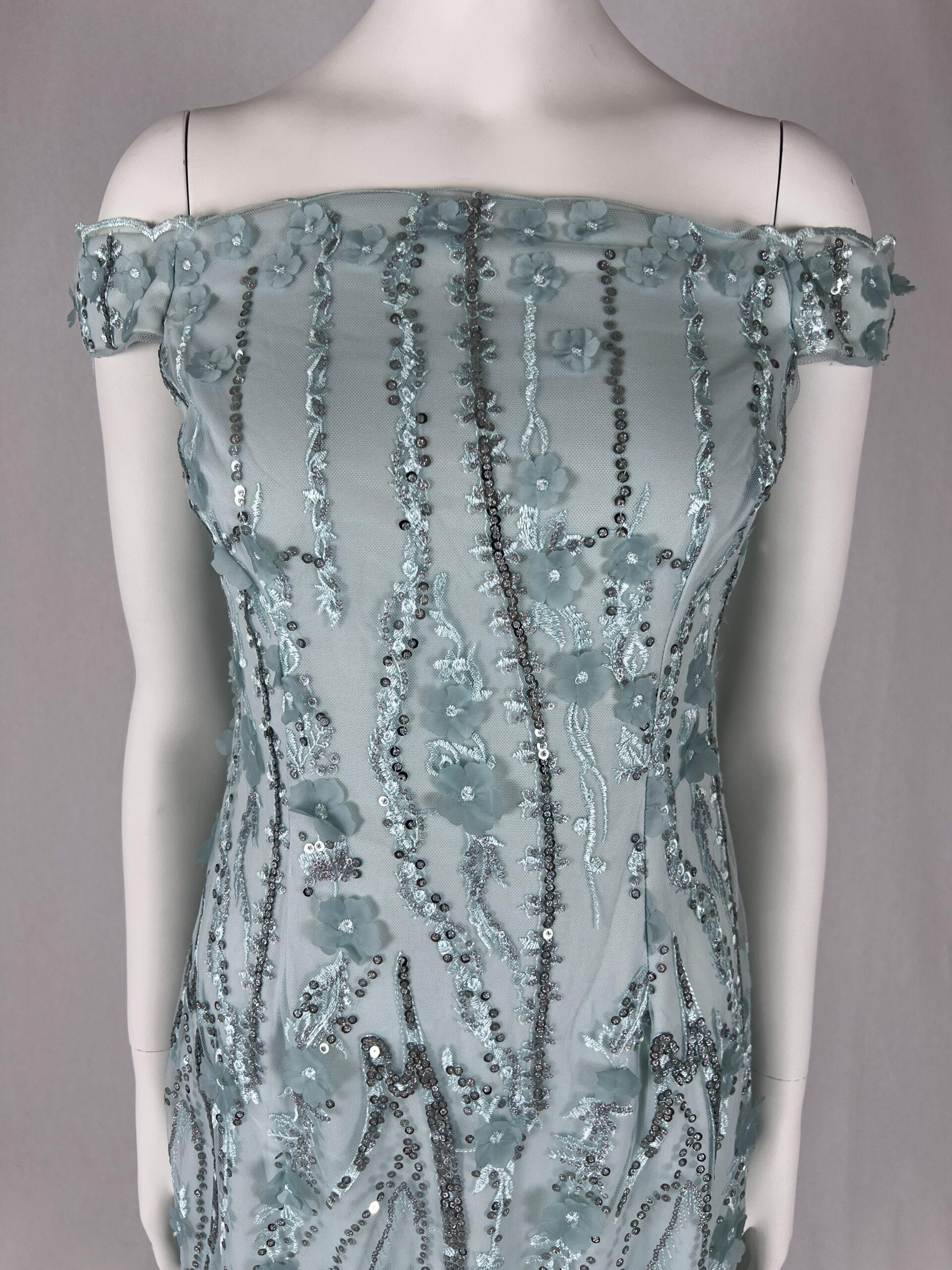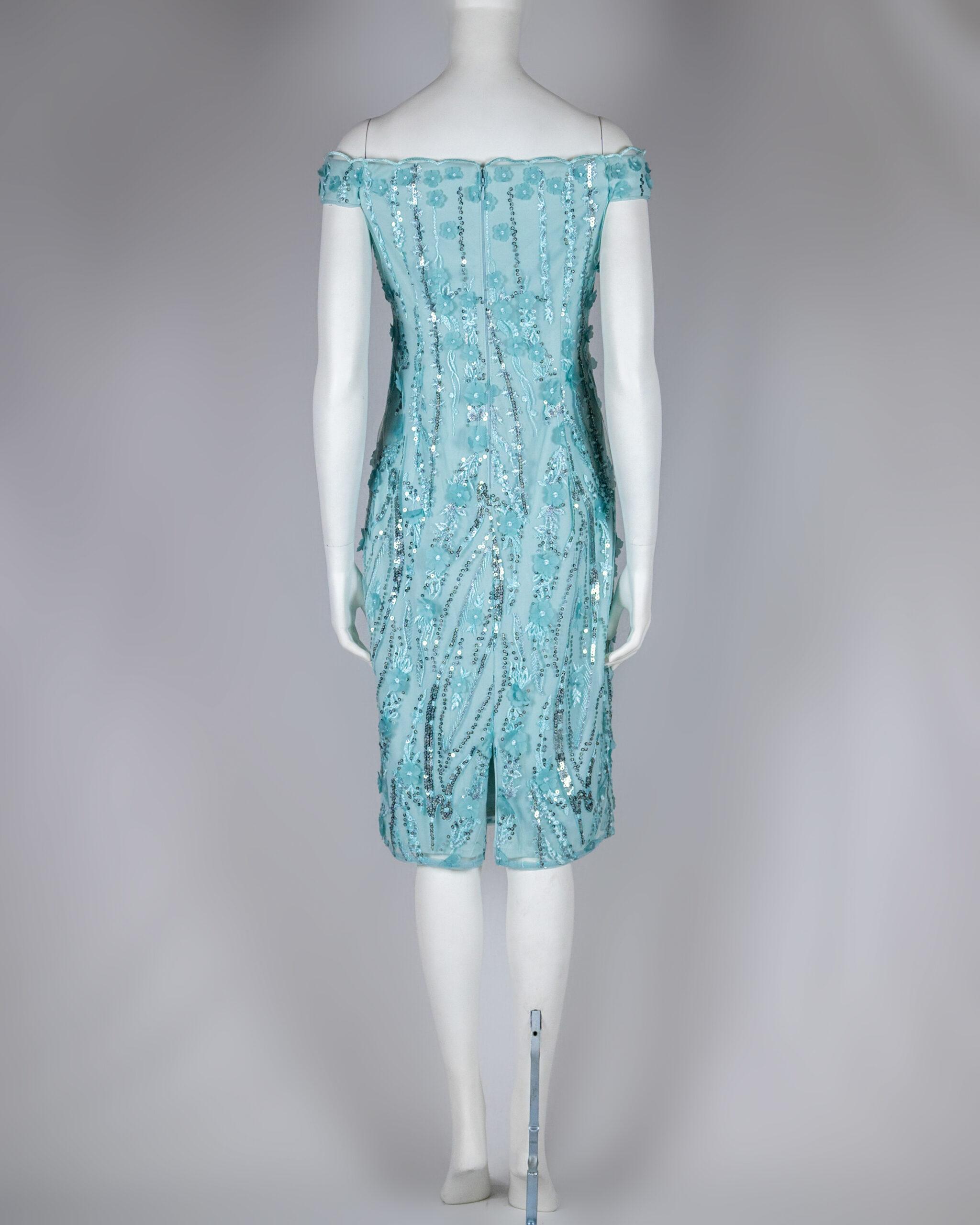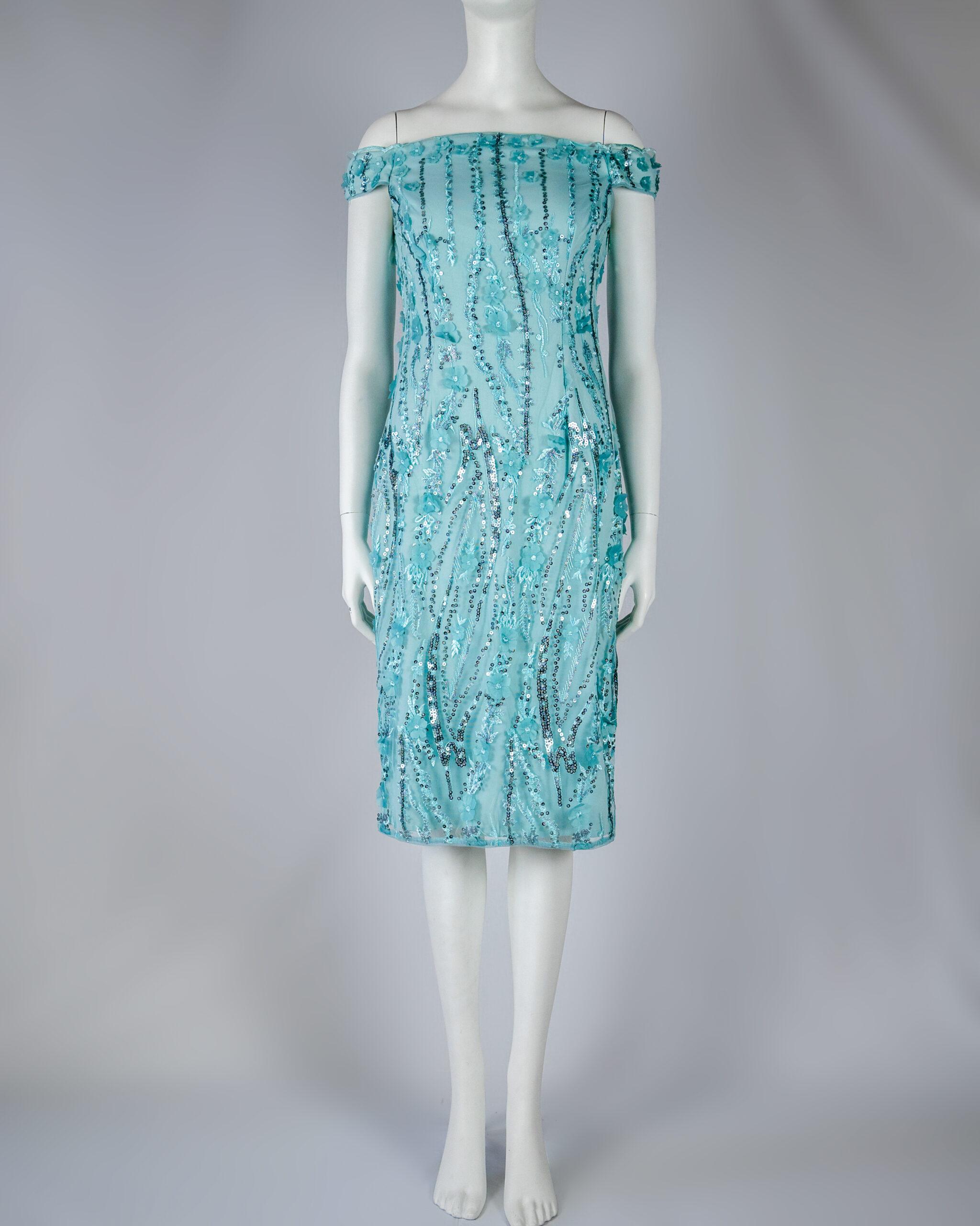 Our iconic midi sheath dress gets glamorous with delicate hand sequined embellishments and 3D floral embroidery for a feminine look and feel. We love the chic off-the-shoulder silhouette. Back hook and zip closure. An easy add-to-cart for your next cocktail hour bridal shower rehearsal dinner or black-tie gala.