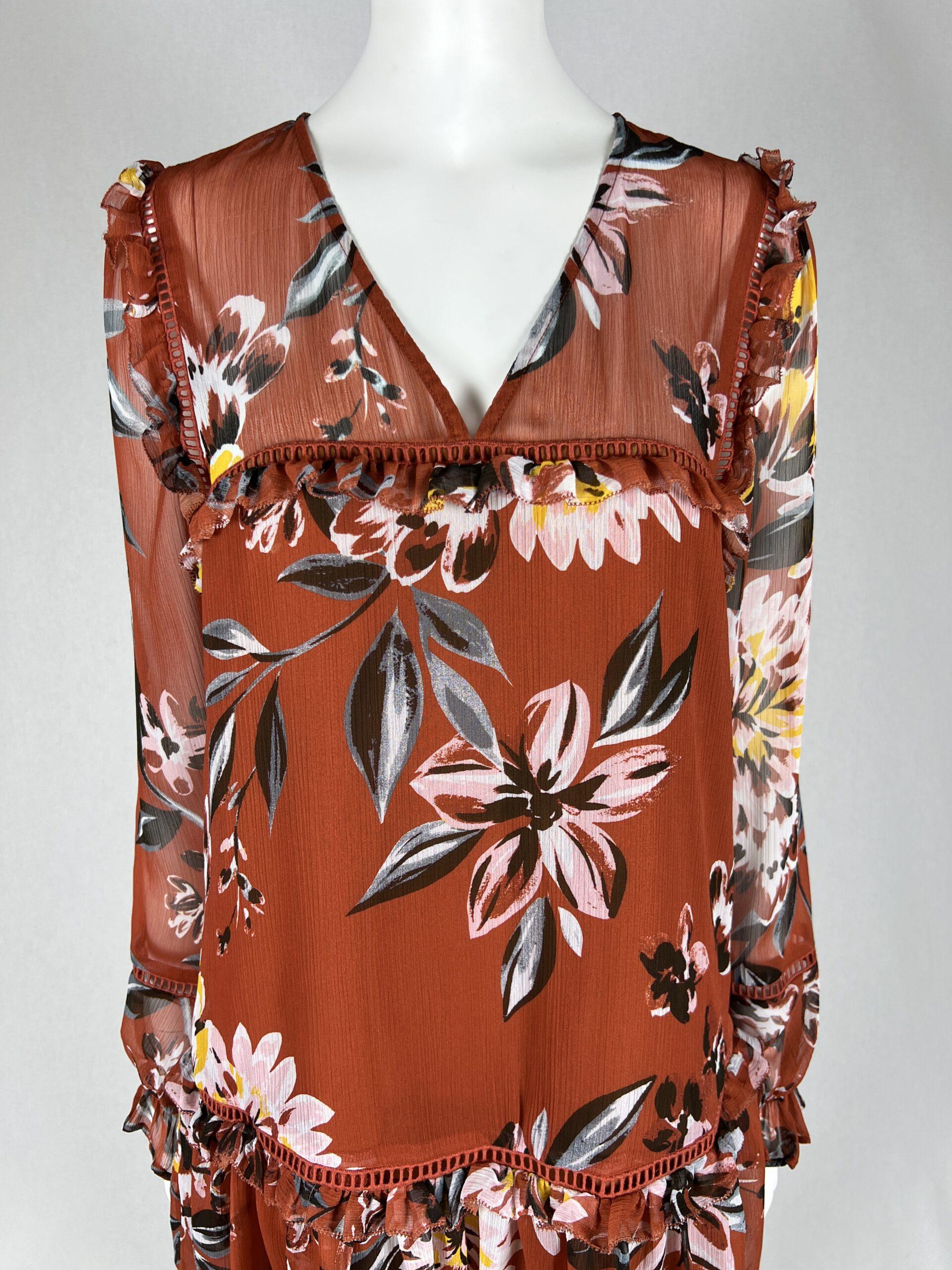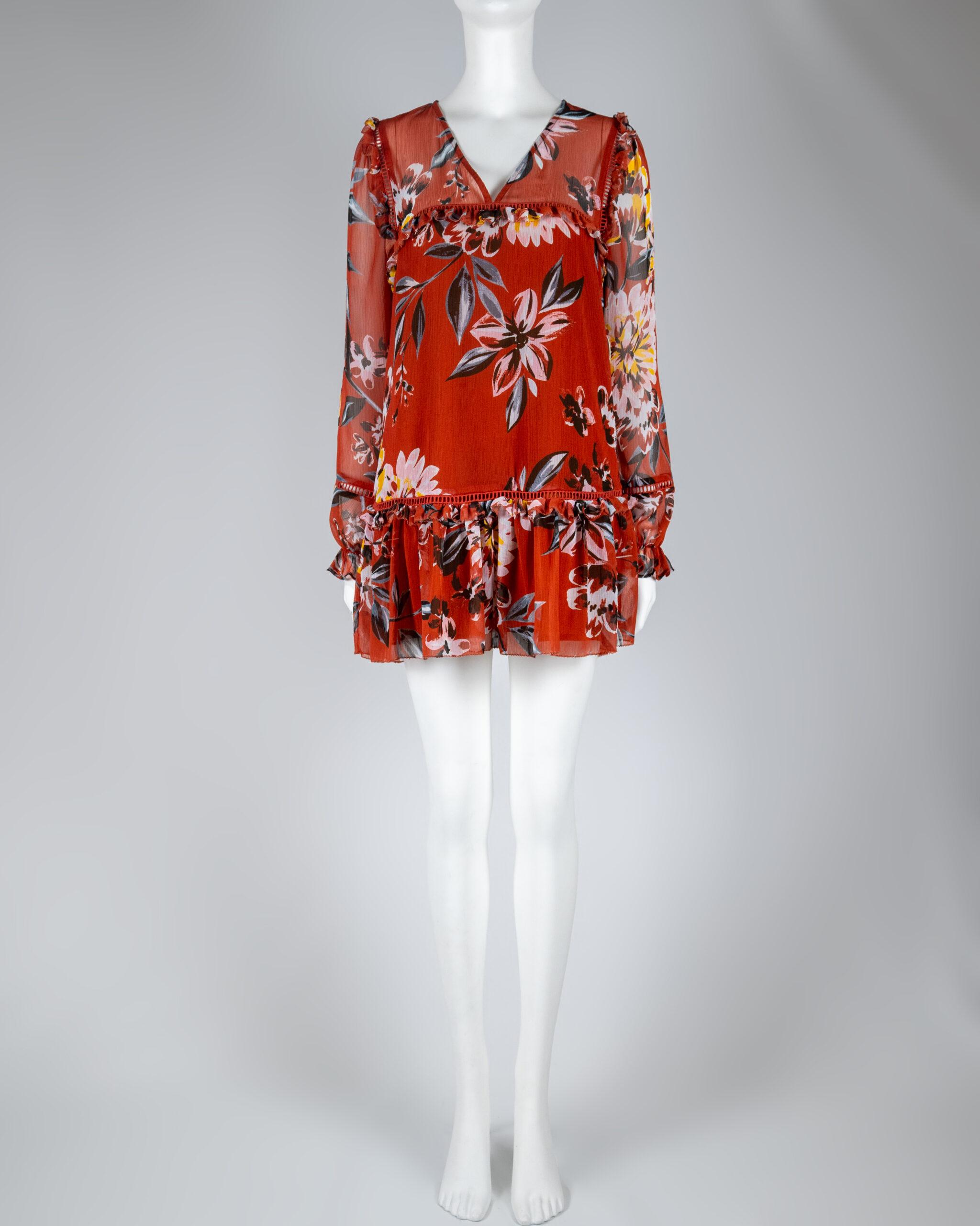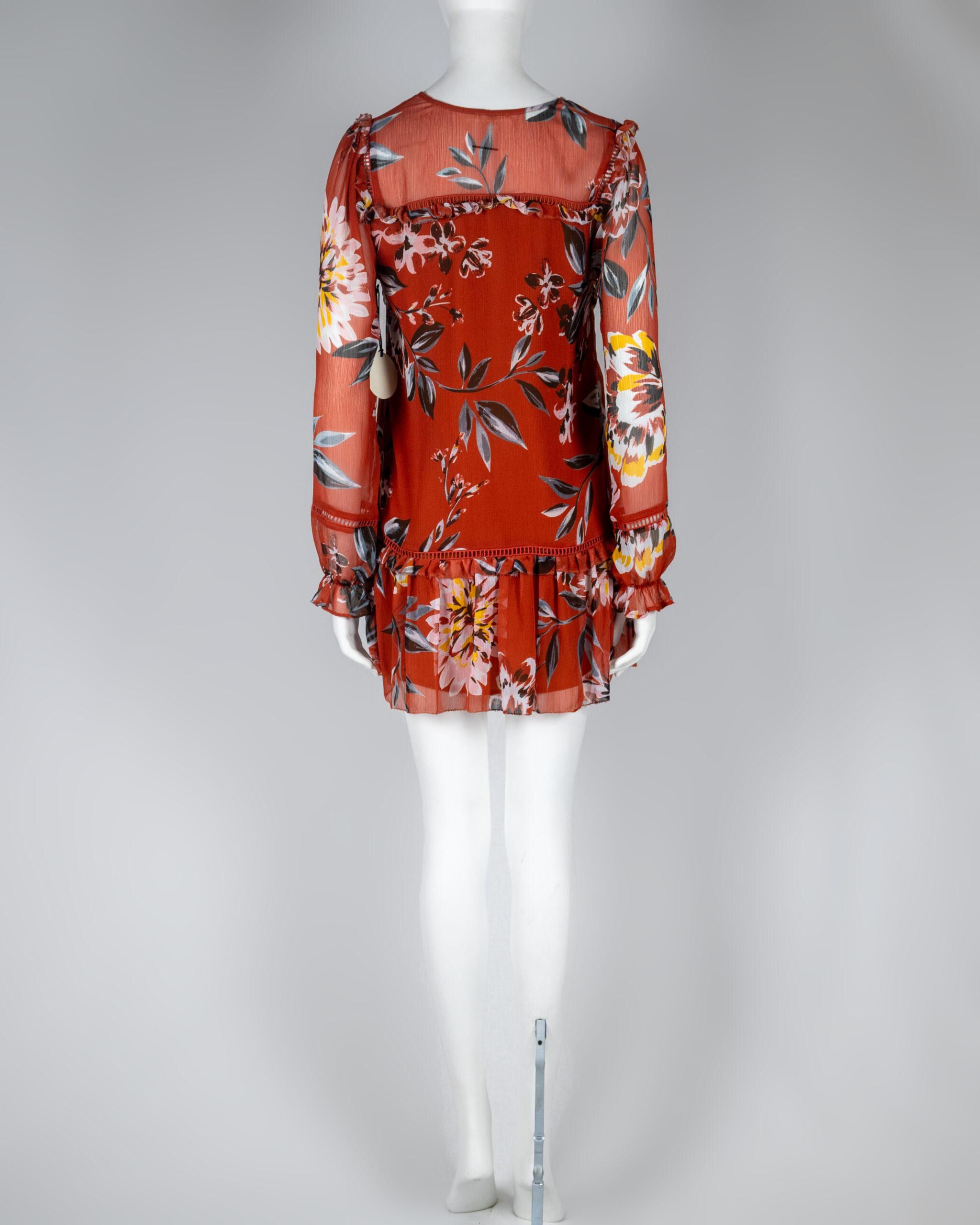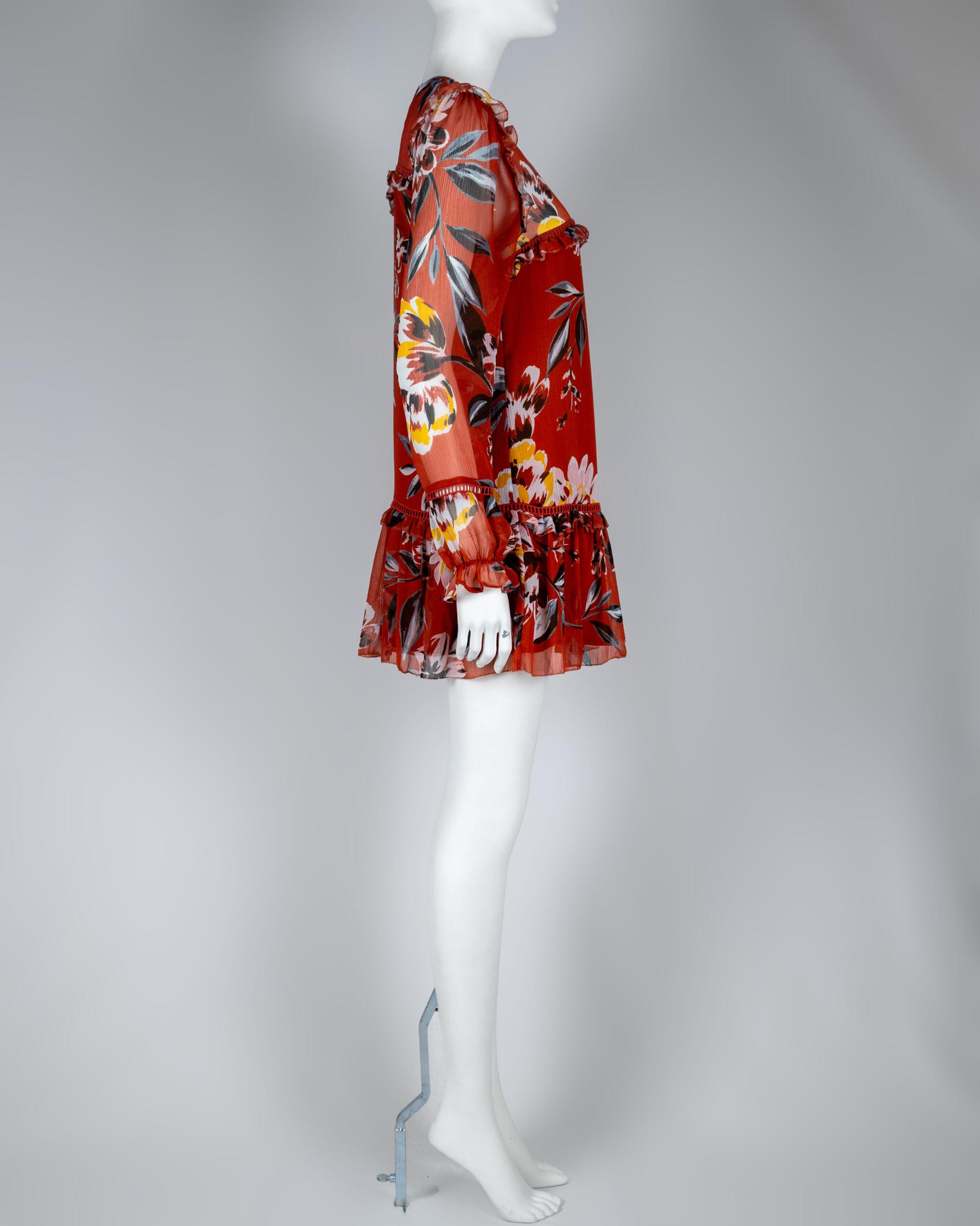 Autumn colors aren’t just for fall, and the warm palette of the Tularosa Lara Dress proves that golden yellow and burnt orange are year-round classics. This flirty and floral mini dress features a drop waist design, semi-sheer sleeves and a V-shaped neckline for cute and comfy styling, no matter the season. Ruffle details throughout.