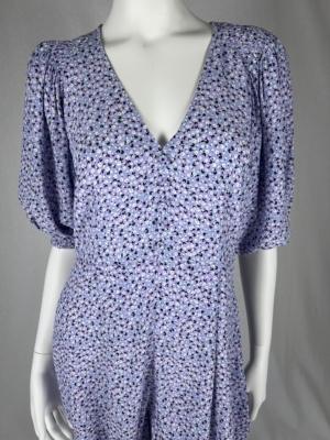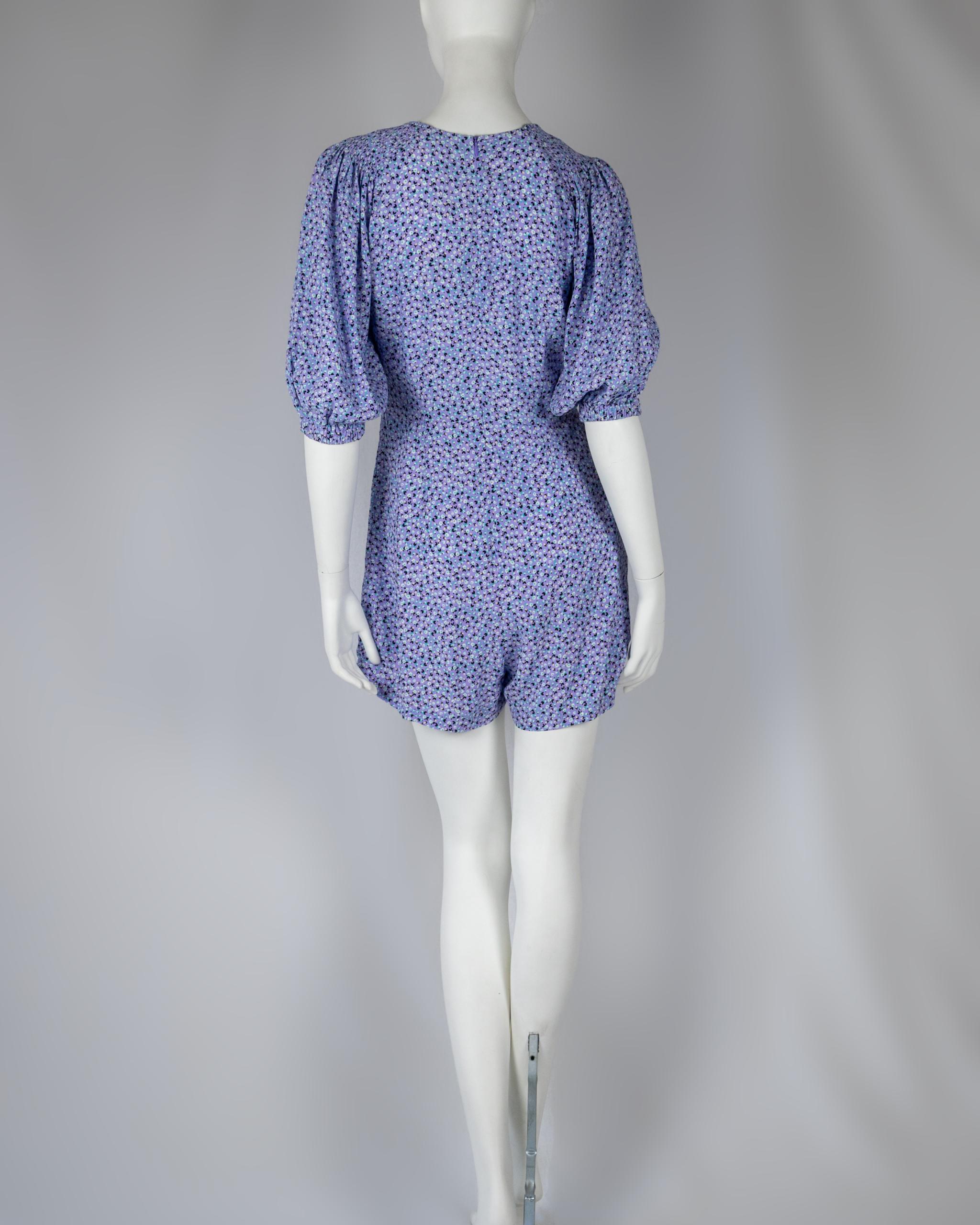 This lavender floral romper features a soft, pastel lavender color as its base. It’s adorned with a floral print, which include delicate flowers in shades of white and blue. Rompers are known for their one-piece design, combining shorts and a top into a single garment, making this both stylish and comfortable for warm weather. The lavender color adds a touch of elegance, while the floral patterns lend a whimsical and feminine feel to the outfit.