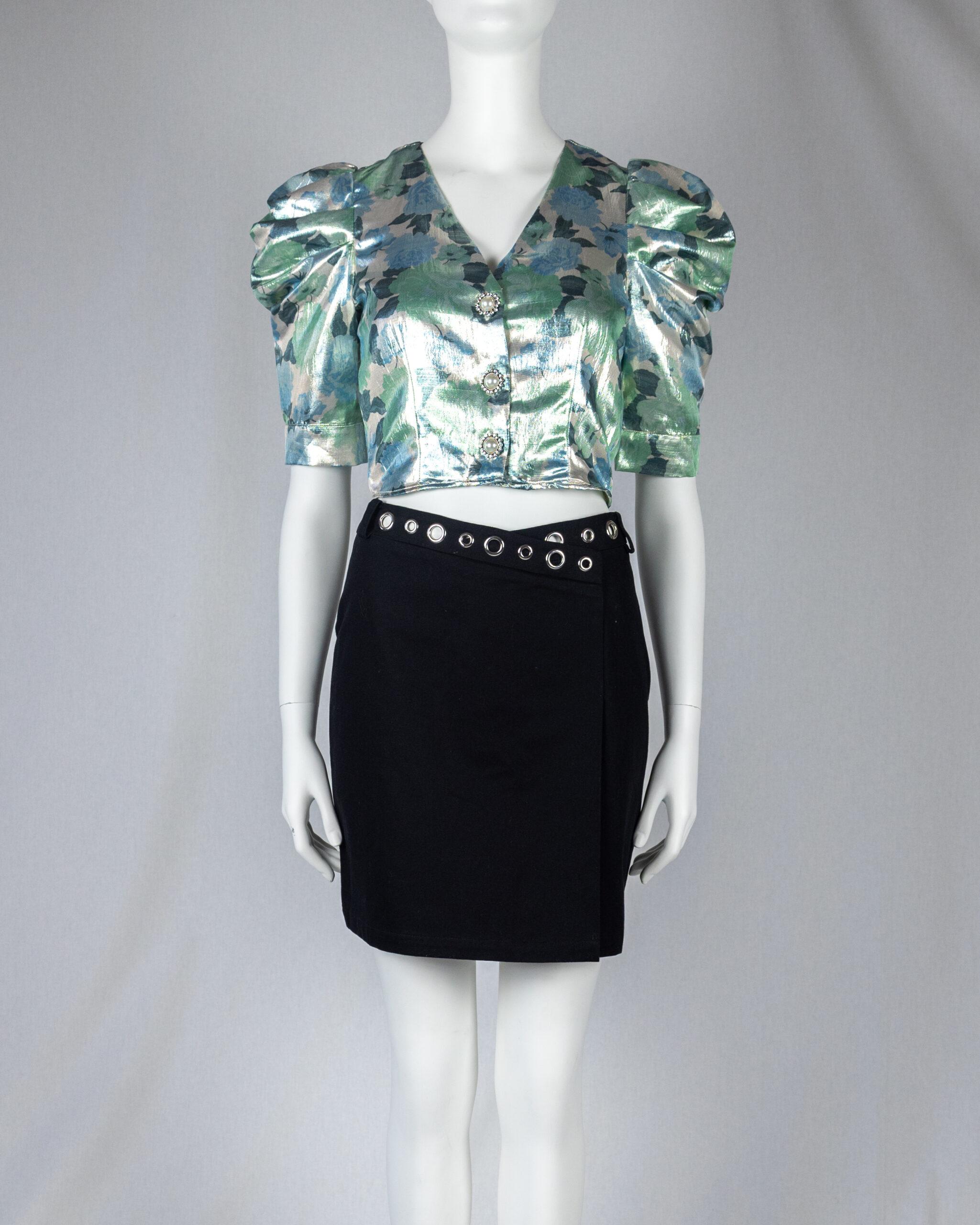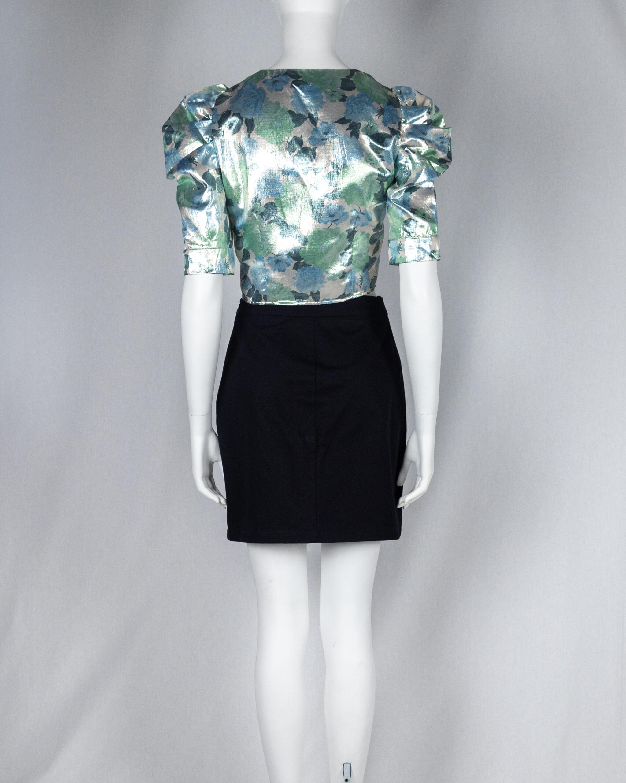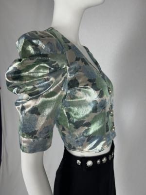 This metallic puff sleeve top exudes glamour and modern flair. The sleeves are voluminous and gathered at the shoulders, creating a dramatic silhouette. The metallic fabric adds shimmer and shine, catching and reflecting light for a striking effect. The bodice of the top is more fitted to balance out the statement sleeves, making it a bold yet sophisticated choice for evening wear or special occasions. Pairing it with sleek trousers or a pencil skirt enhances its contemporary appeal, making it a standout piece in any wardrobe.
