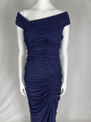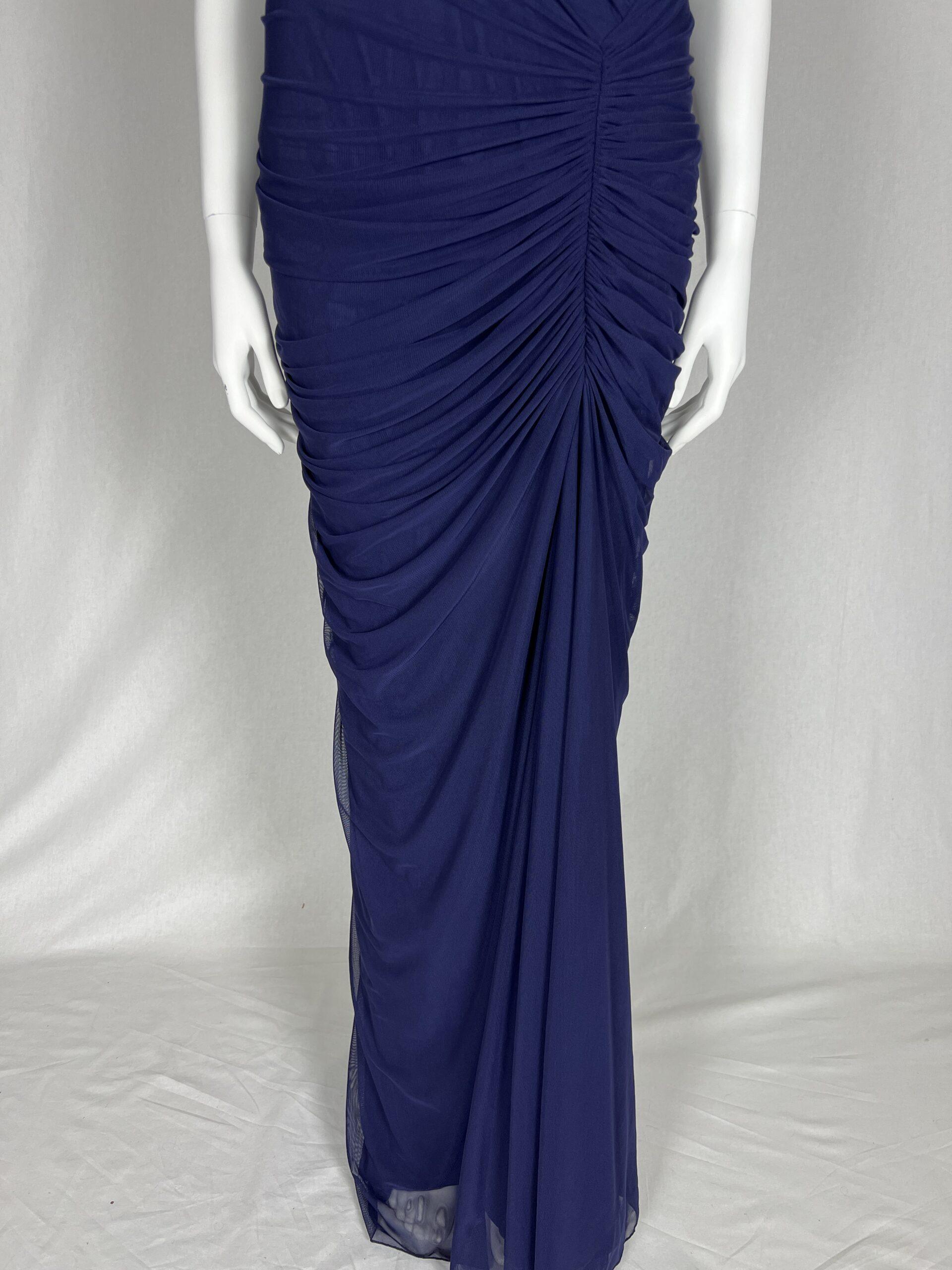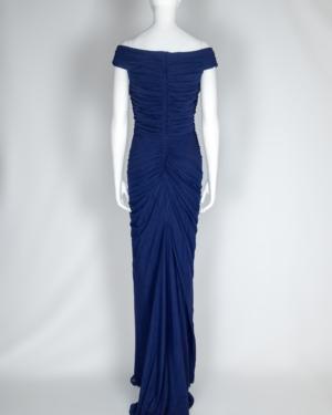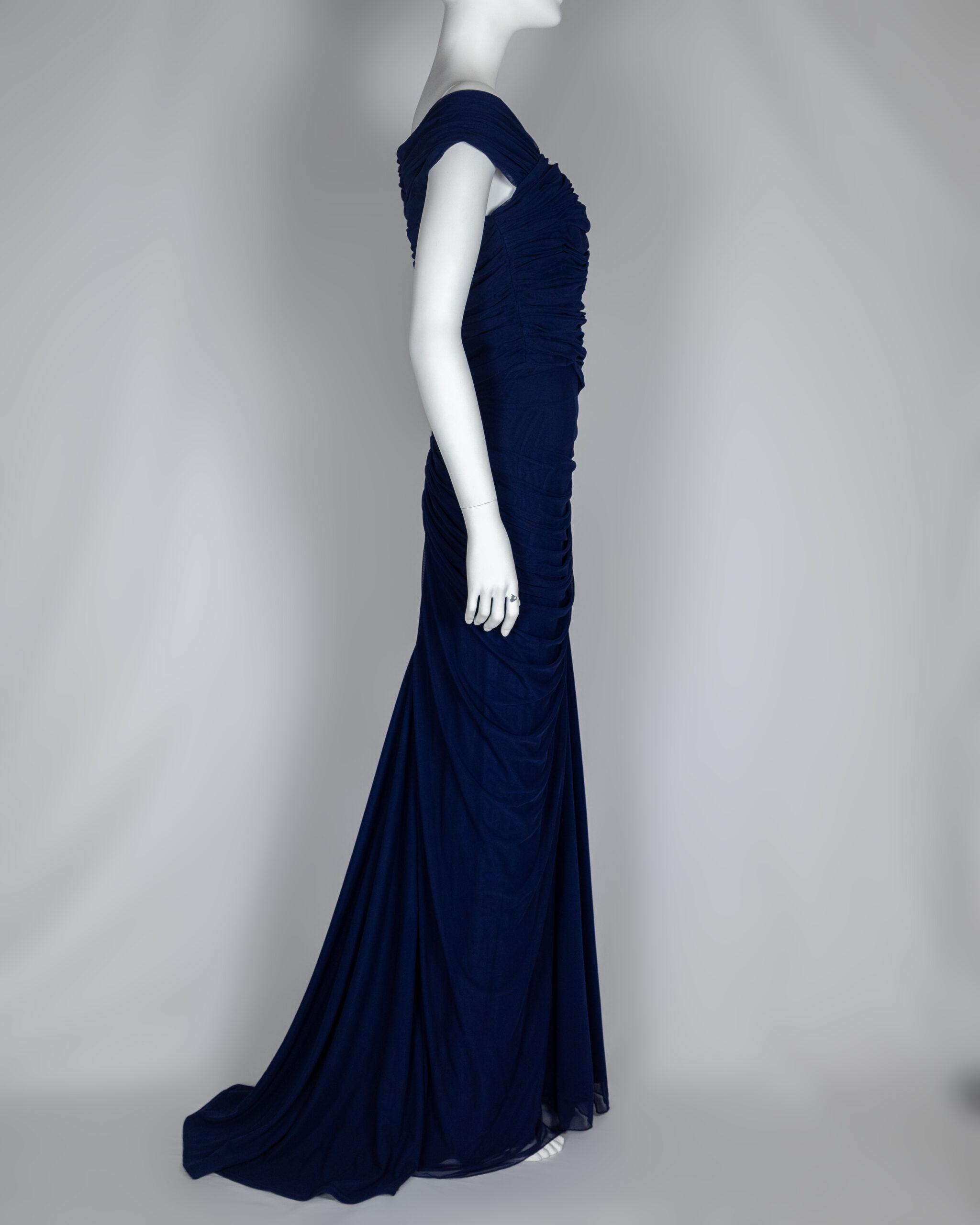 This gown is crafted from a rich navy blue mesh fabric, that lends it a luxurious sheen. The color is deep and sophisticated, evoking a sense of evening elegance. The bodice of the gown is fitted, accentuating the natural curves of the wearer, and features intricate ruching that starts at the neckline. It’s a timeless choice for formal occasions, combining rich color with intricate detailing to create a stunning and sophisticated look.