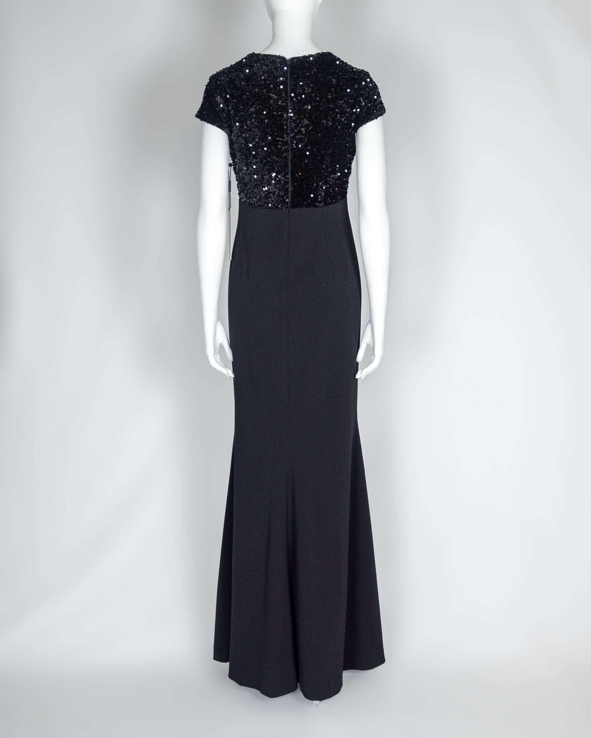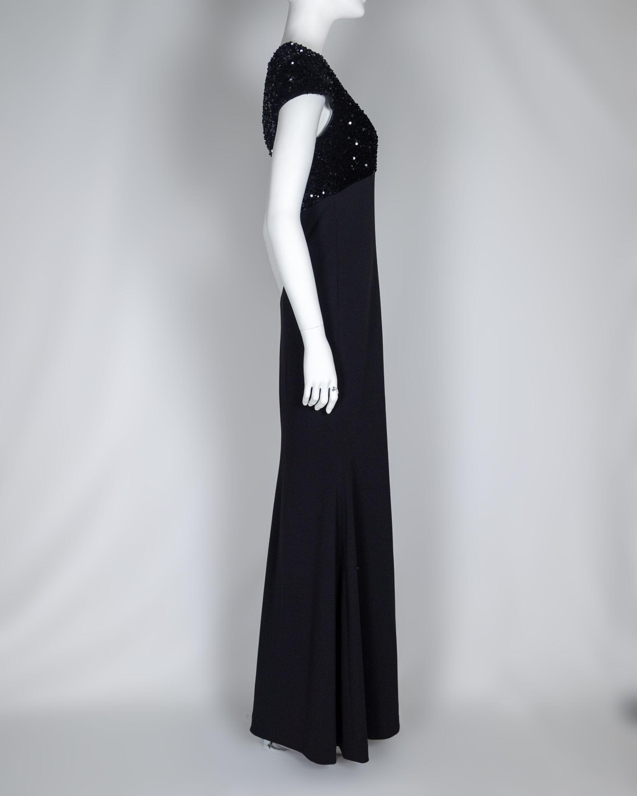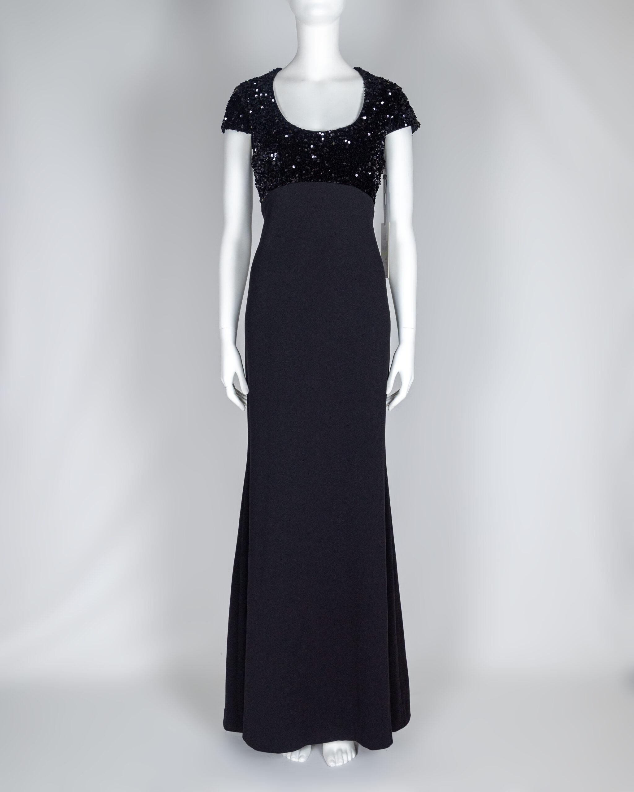 Sequins covering the bodice of this Calvin Klein evening gown bring drama to your formal closet.
