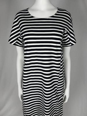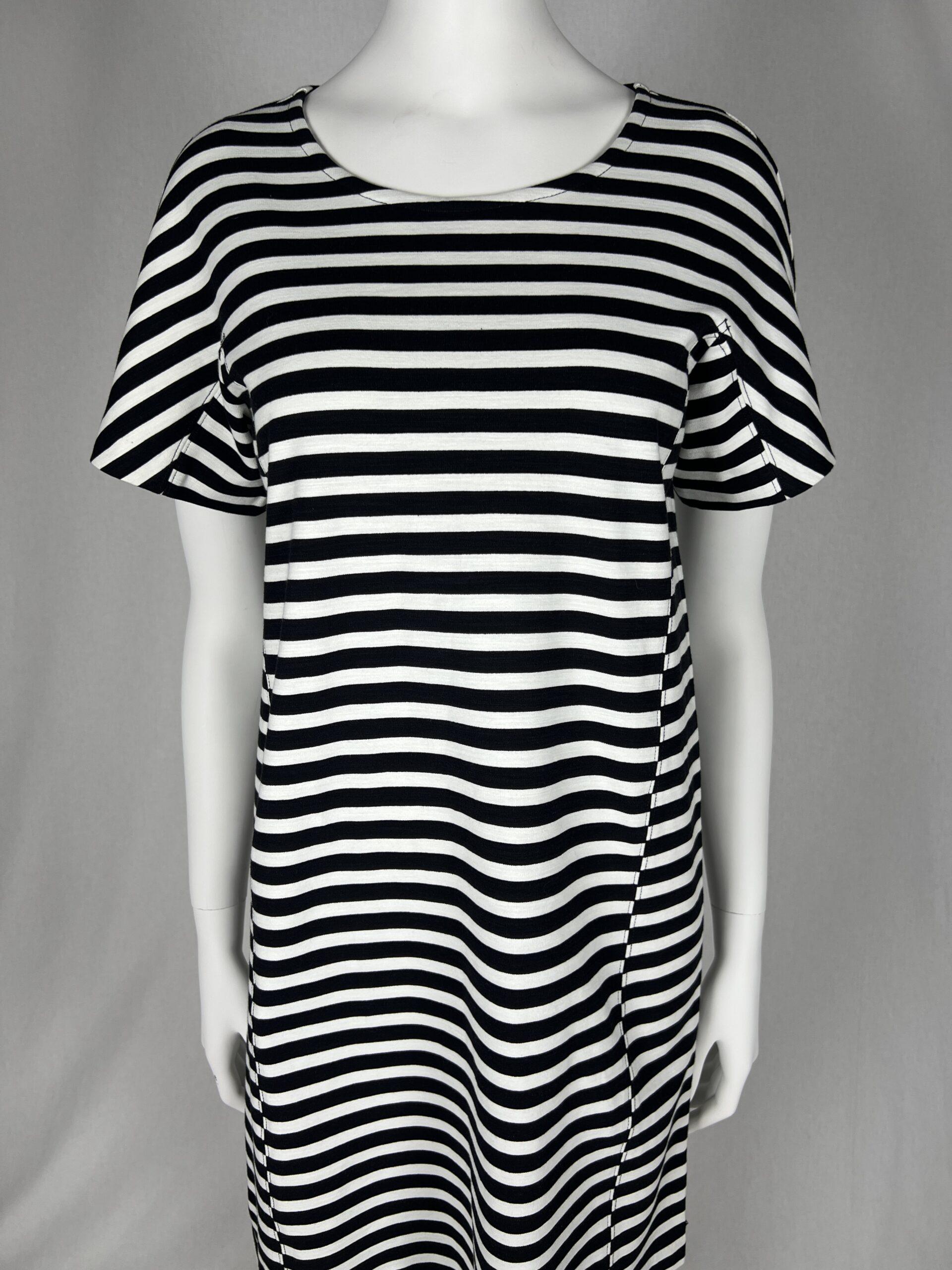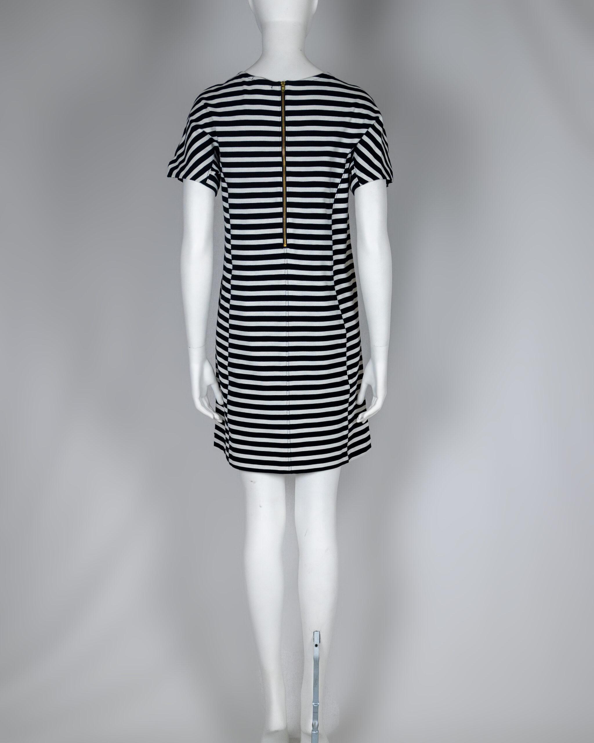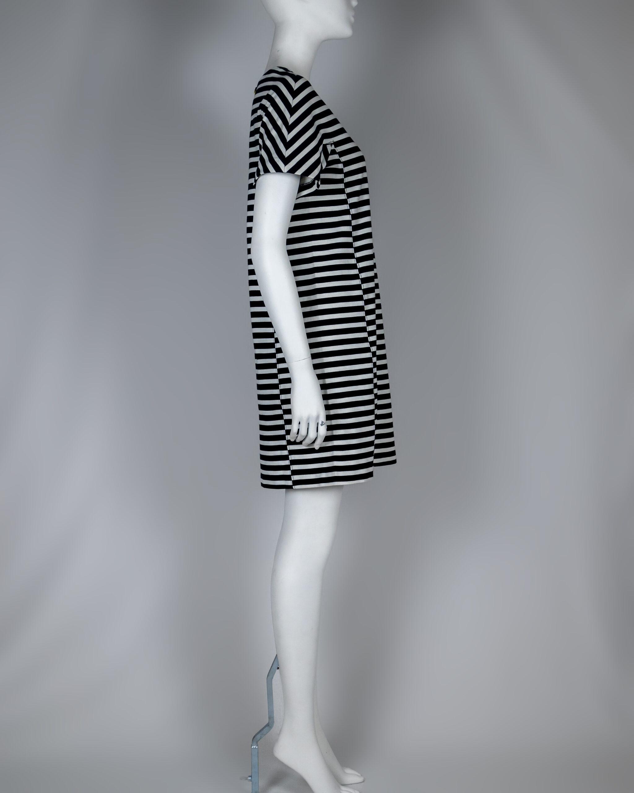 This shift dress features short sleeves and a straight silhouette that falls just above the knee. It’s a versatile and classic piece, suitable for casual occasions.
