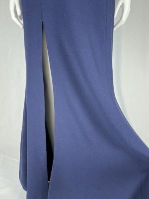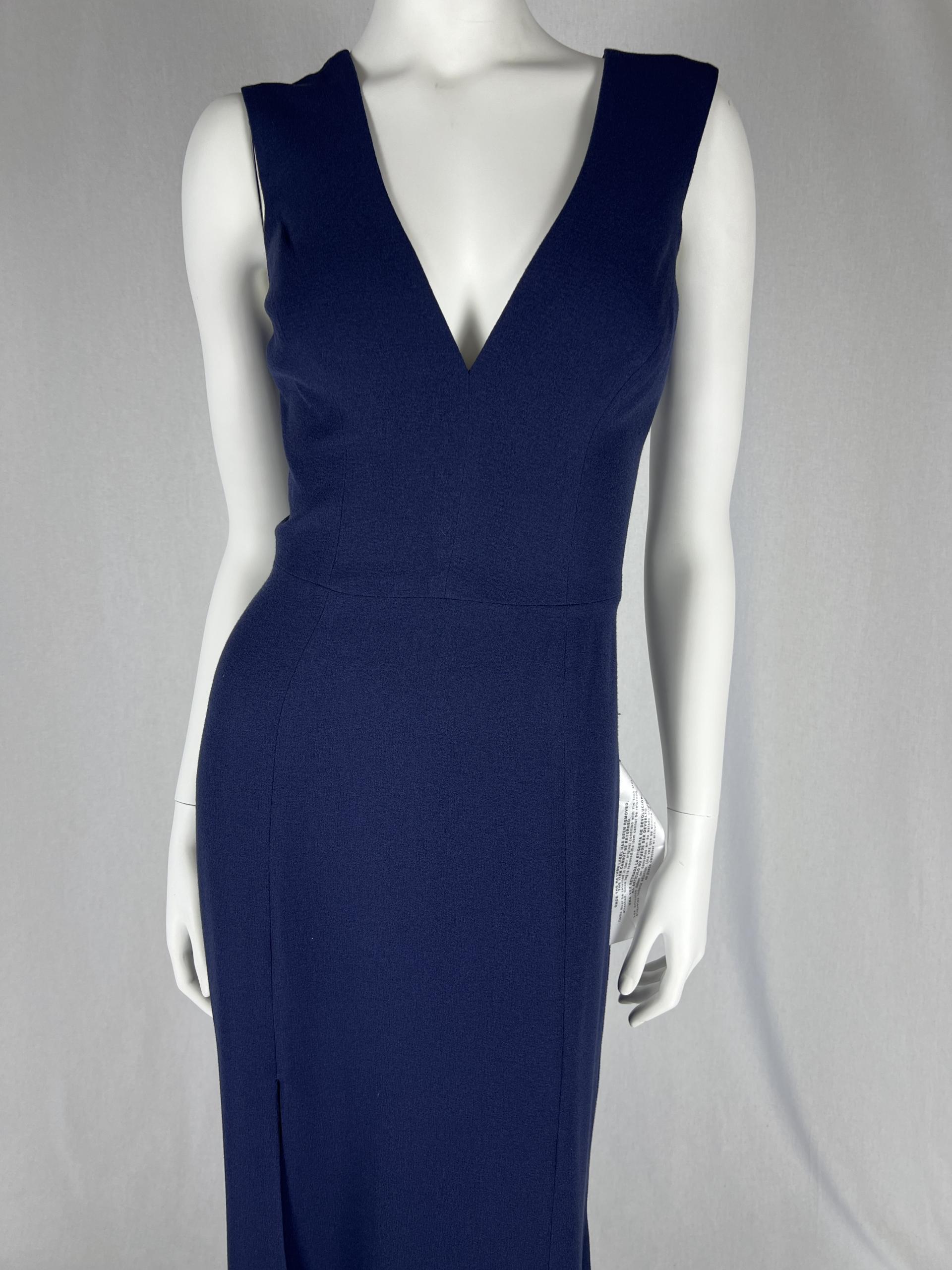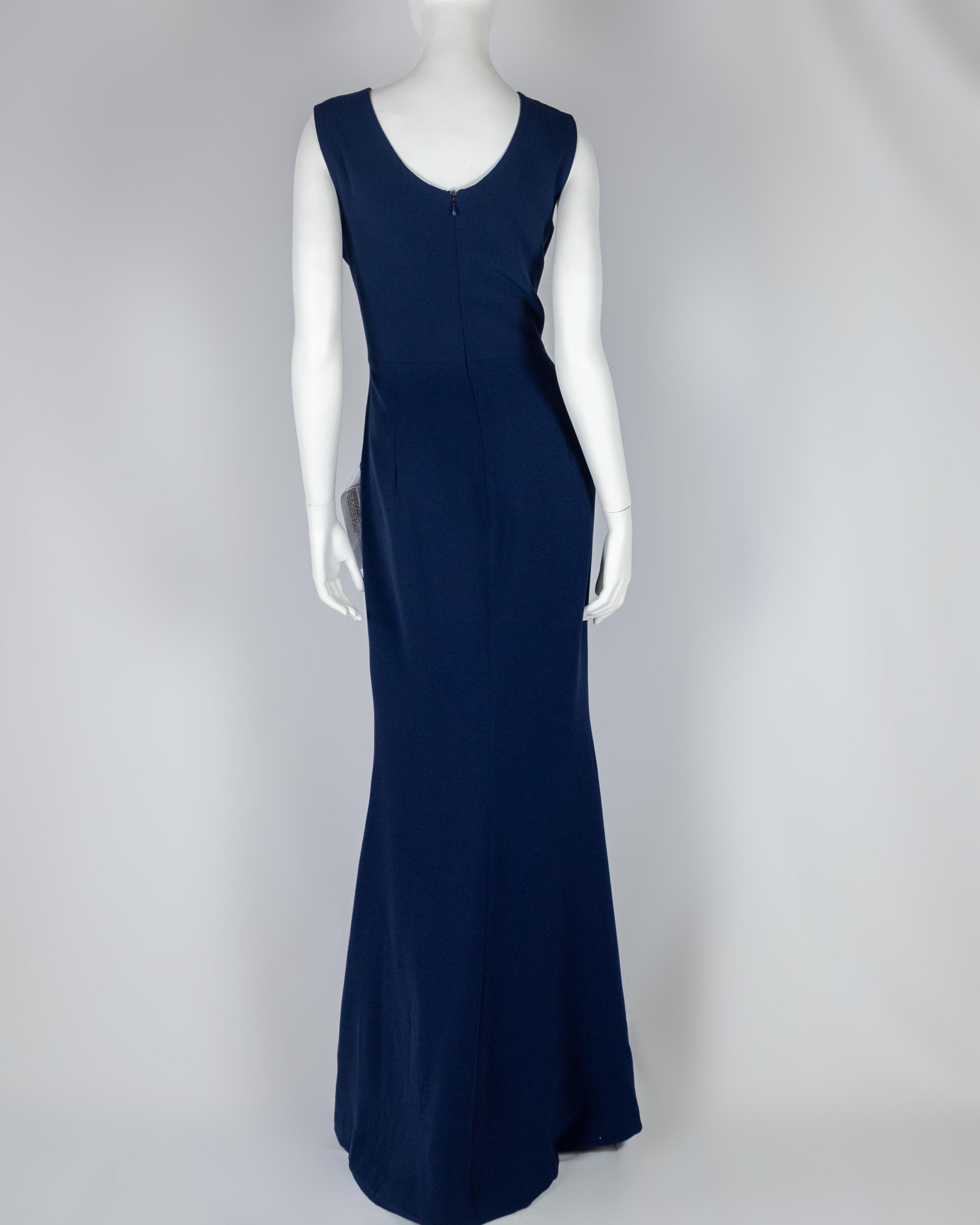 This striking floor-length style is made in our classic stretch crepe. This sleeveless mermaid gown fits snuggly through the torso and hips and has a subtly flared skirt. It features a plunging v-neckline, curved v-back, and a thigh-high side slit.