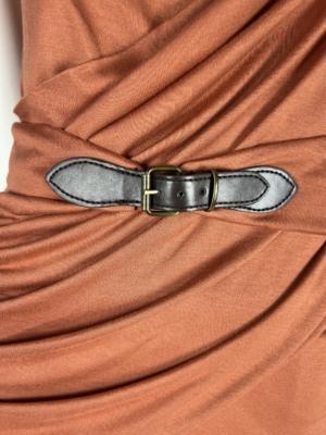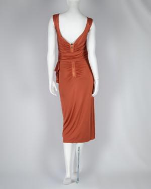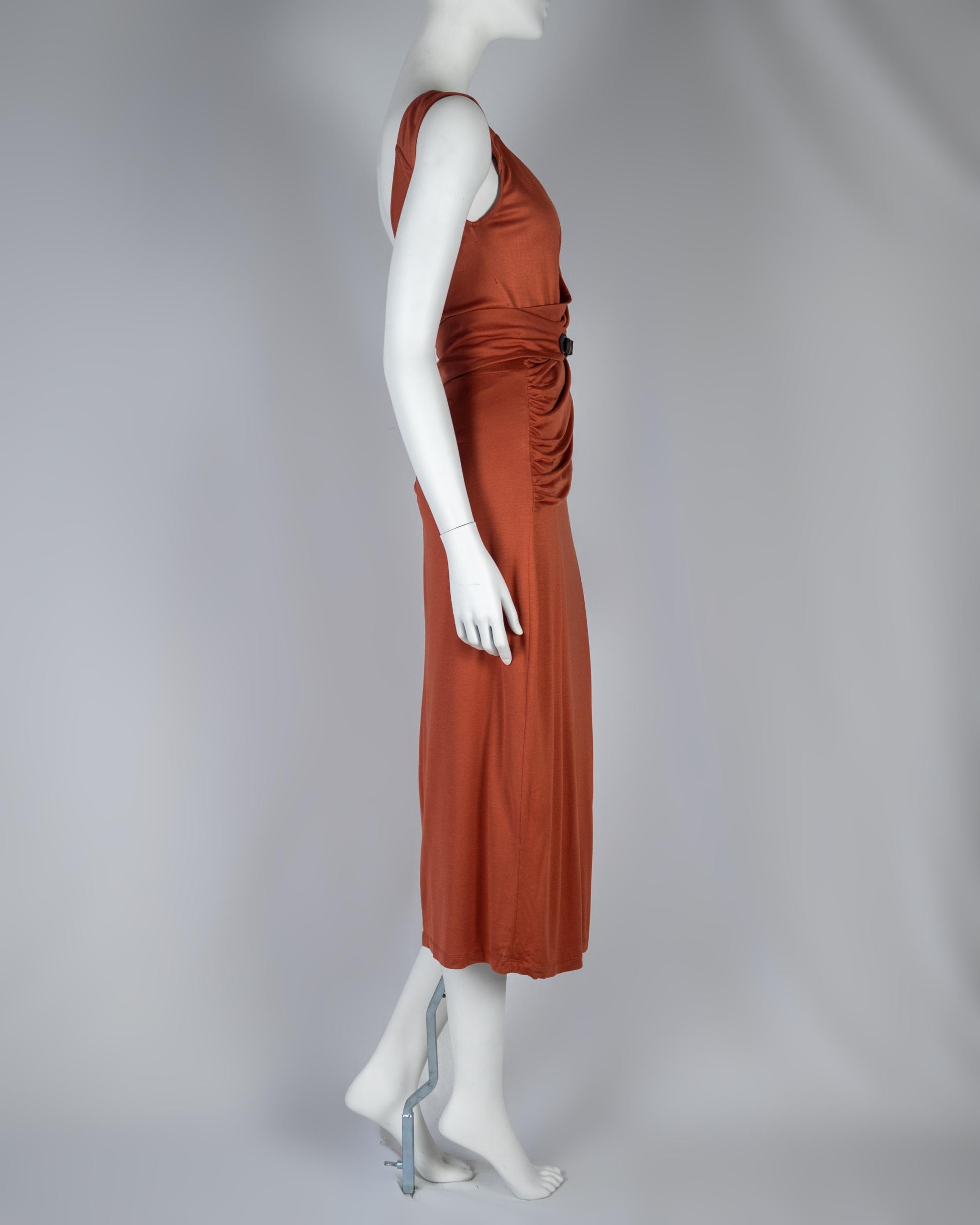 This burnt orange midi dress crafted from soft, gathered jersey fabric. The dress features a fitted bodice with a flattering v neckline, enhancing its relaxed yet elegant appeal. The gathered details, which start at the shoulders and cascade down the sides, create gentle draping that cinches at the waist, accentuating your shape while offering comfort and flexibility. The skirt falls gracefully to a midi length, hitting around the mid-calf, and moves fluidly with each step. The jersey material, known for its stretch and softness, adds a touch of casual sophistication, making this dress versatile for both daytime outings and evening events.