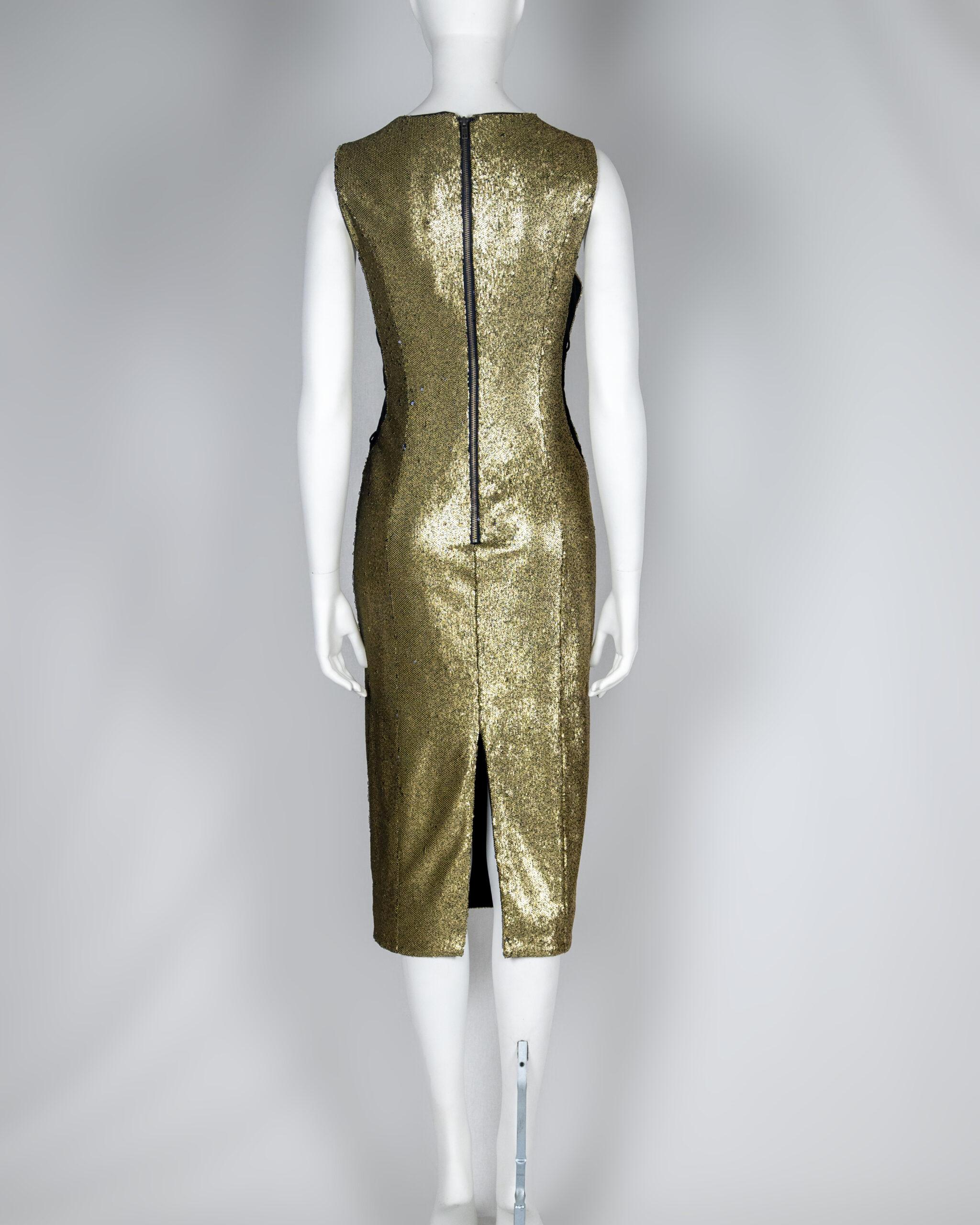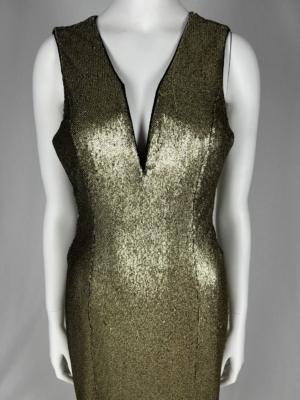 This gold sequin dress is dazzling and eye-catching, adorned with shimmering sequins that reflect light beautifully. It features a fitted silhouette that highlights the body. The color gold adds a touch of luxury and glamour, making it a popular choice for formal events and parties.