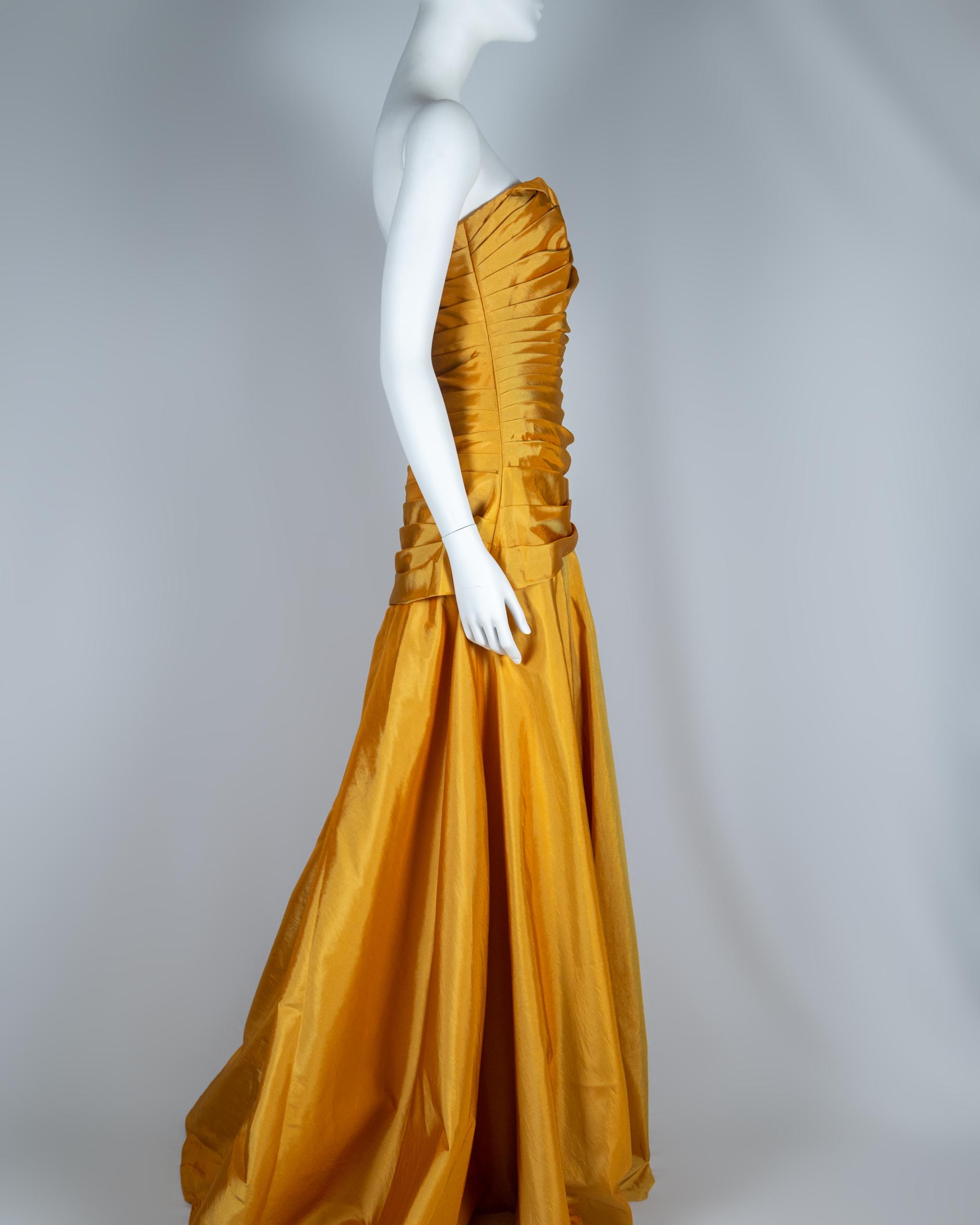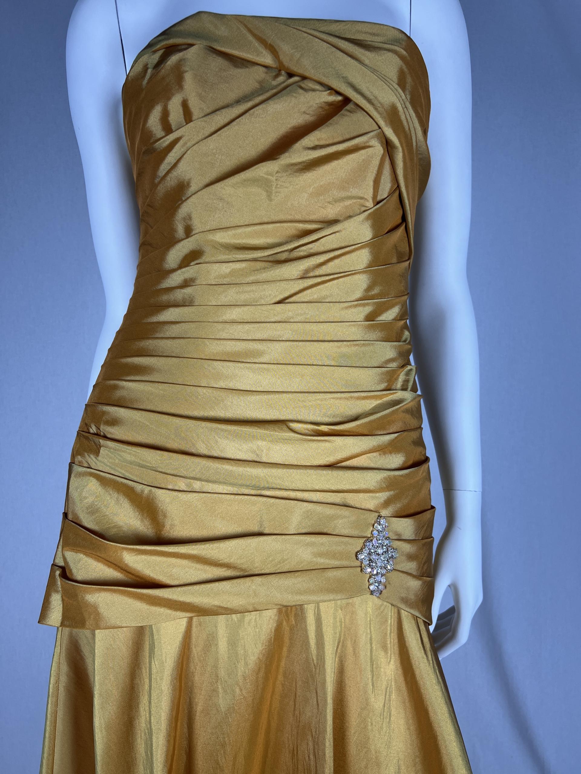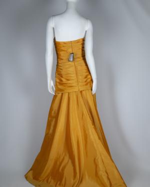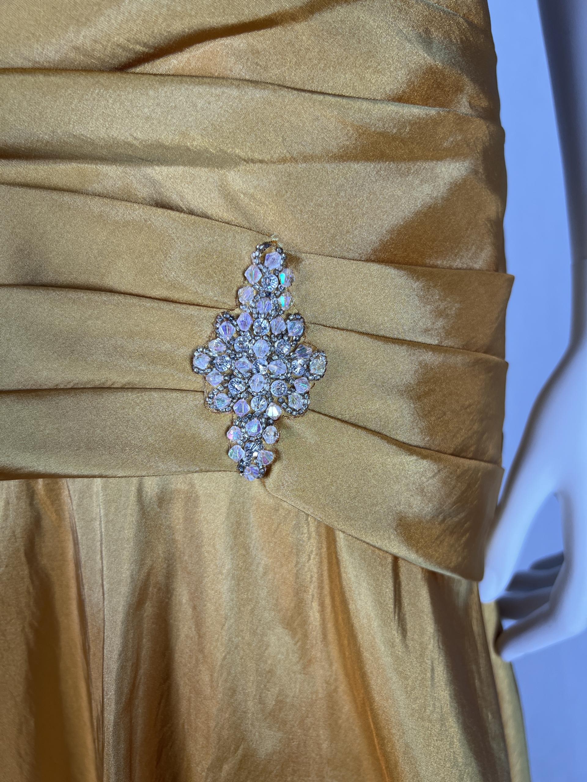 This tangerine gown shimmers with a captivating iridescence, reflecting hues of gold and coral as it catches the light. The gown features a sleek, figure-skimming silhouette that flows gracefully to the floor. At the hip, it is adorned with exquisite embellishments—a cluster of intricate beading—creating a striking focal point that enhances the gown’s elegance and adds a touch of glamour. The overall effect is a radiant, show-stopping look that is both vibrant and sophisticated.