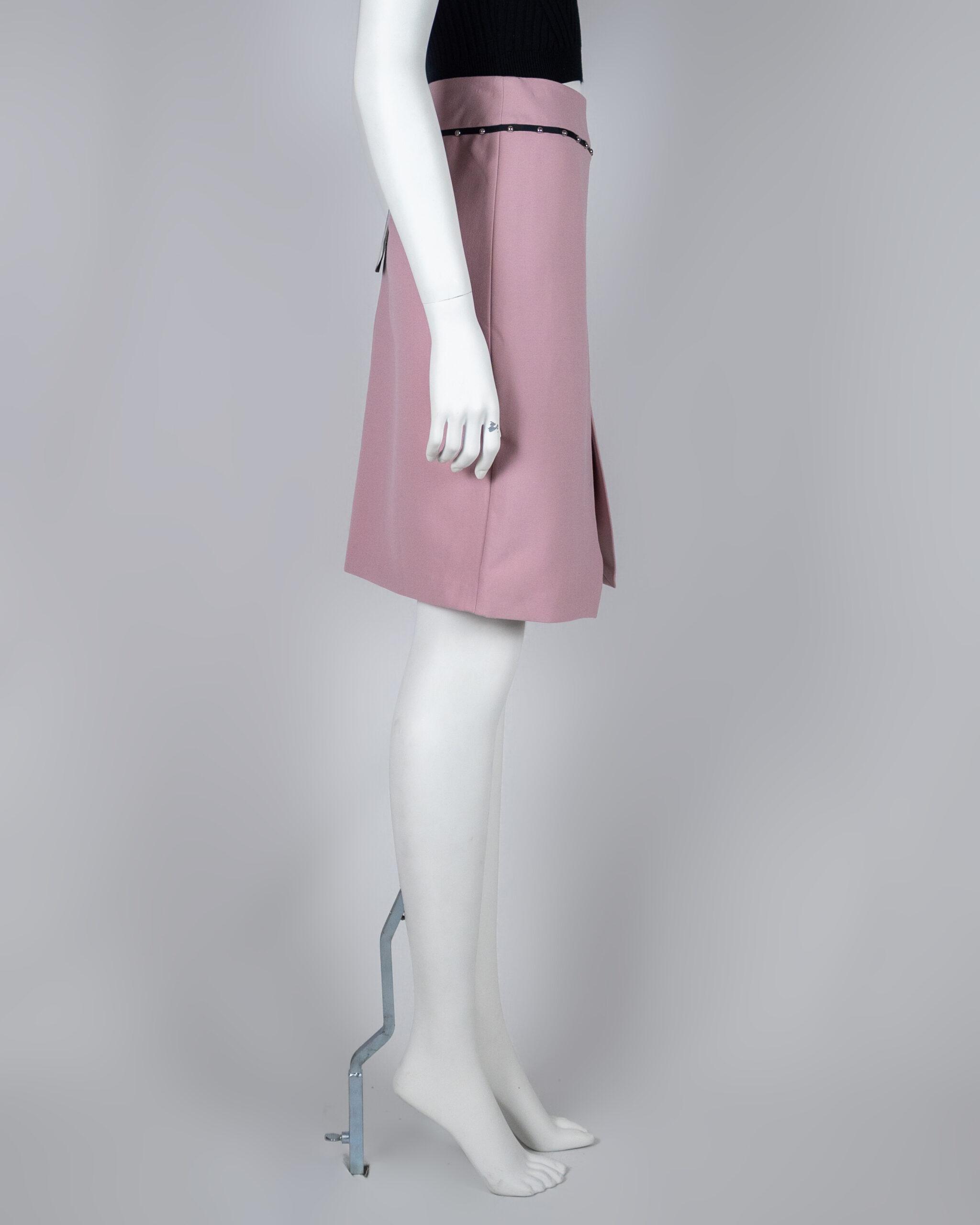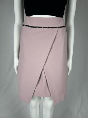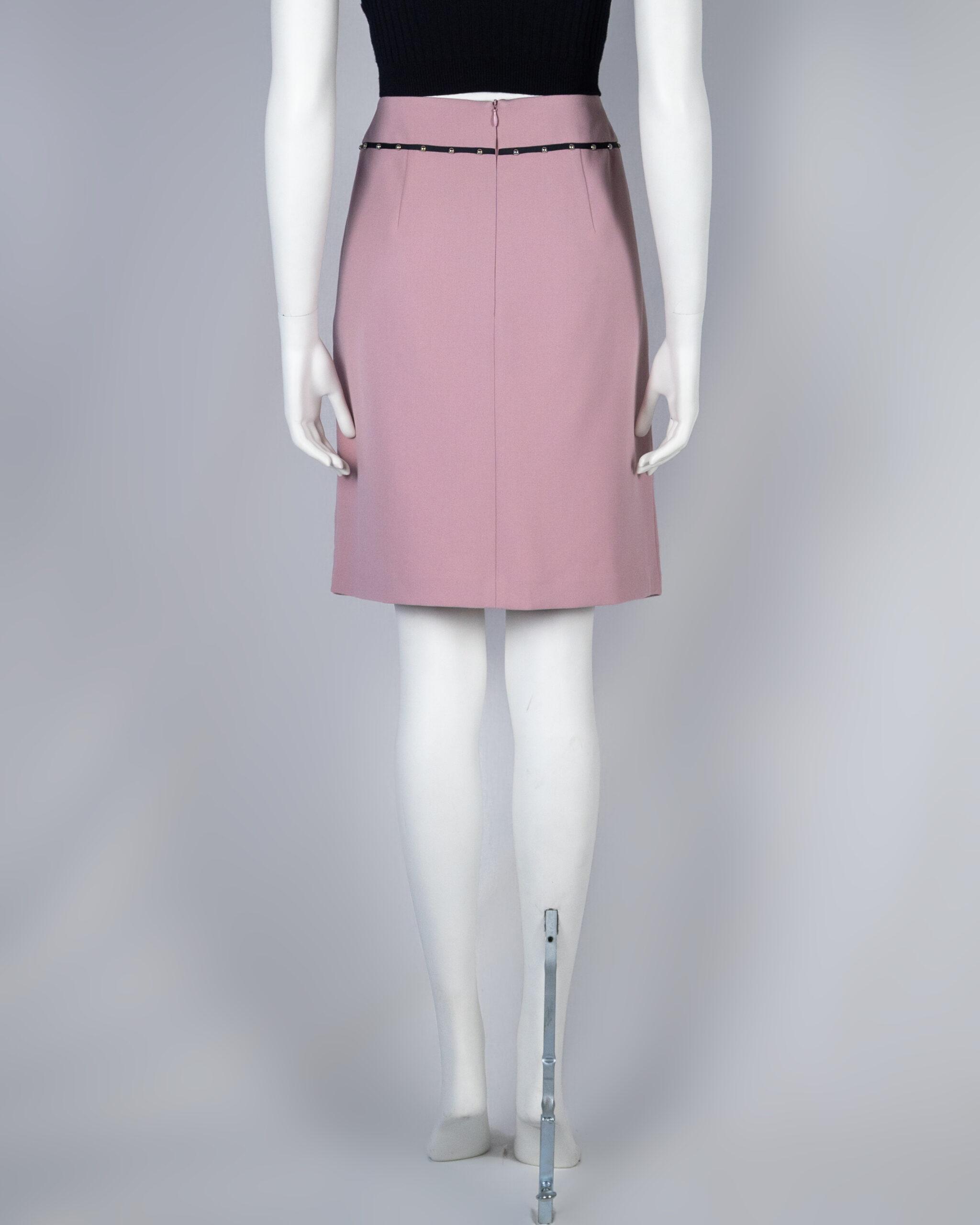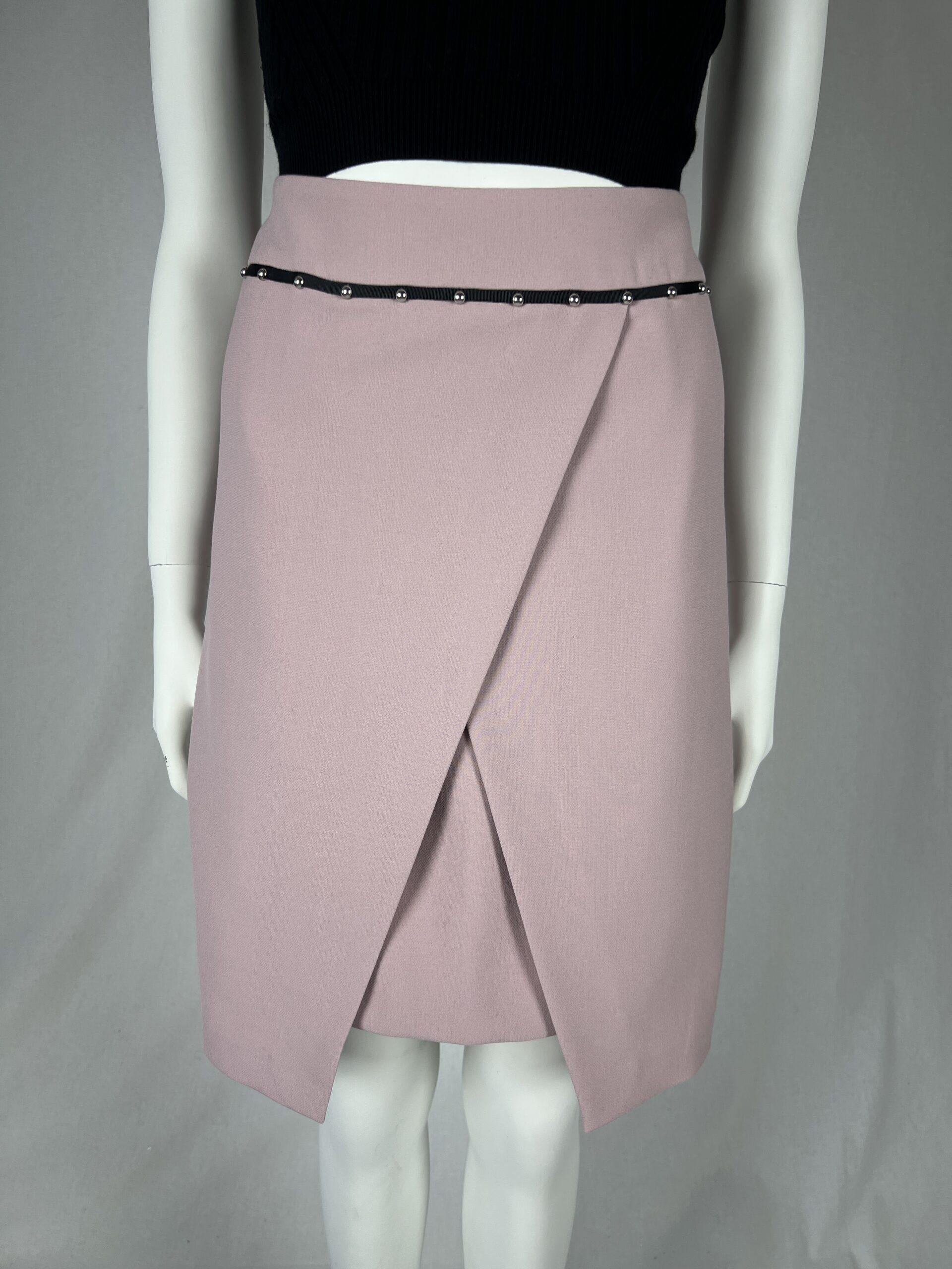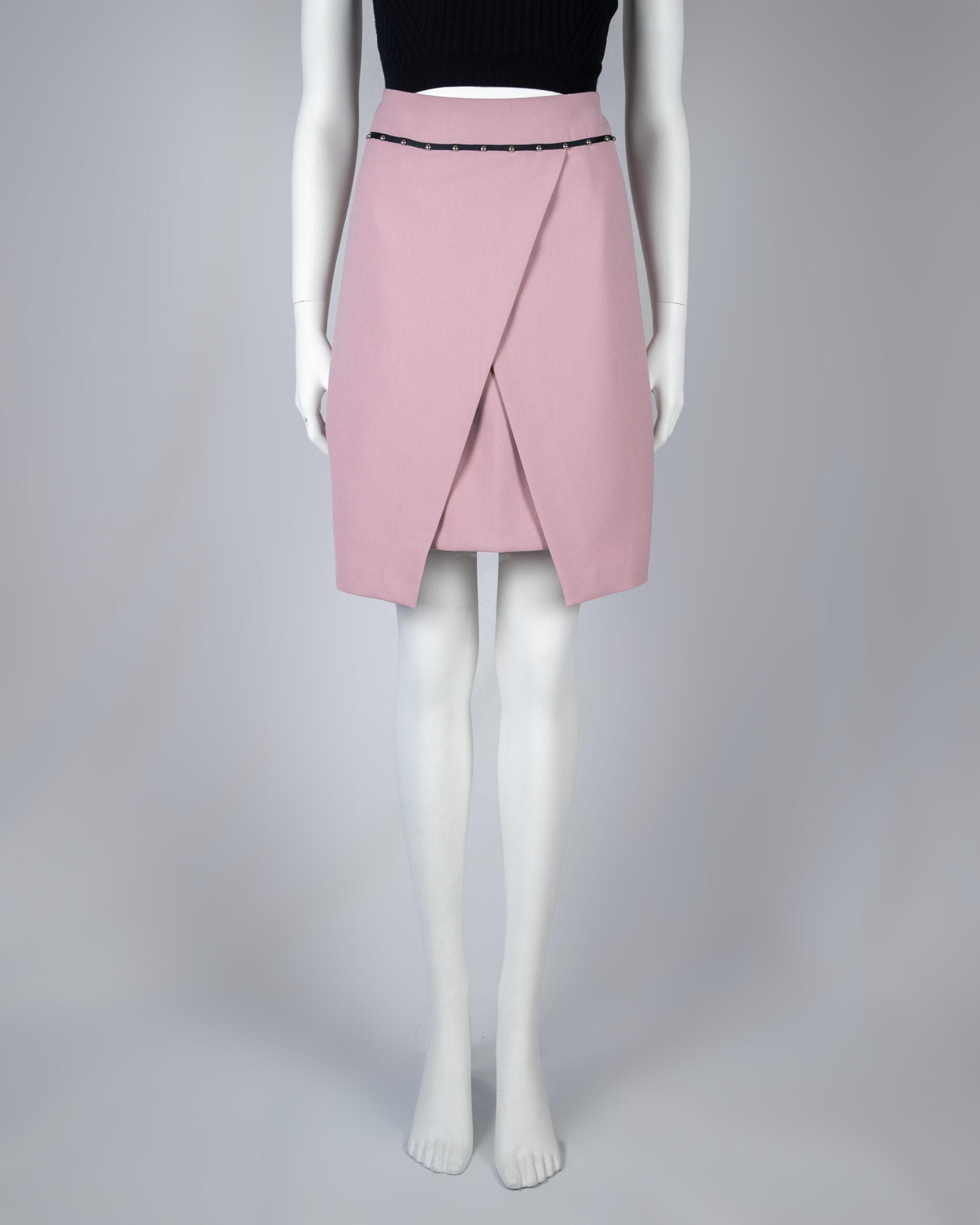 Few garments have the luxury of being truly versatile, taking your look effortlessly from day to night. This skirt is the ultimate in versatile elegance that can be worn for a wide range of occasions. The stretch technical cady model features an applied waistband with grosgrain trims decorated with studs, wraparound skirt.